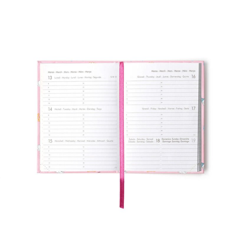 Agenda dispune de închidere cu elastic, semn de carte din panglică și colțuri perforate.