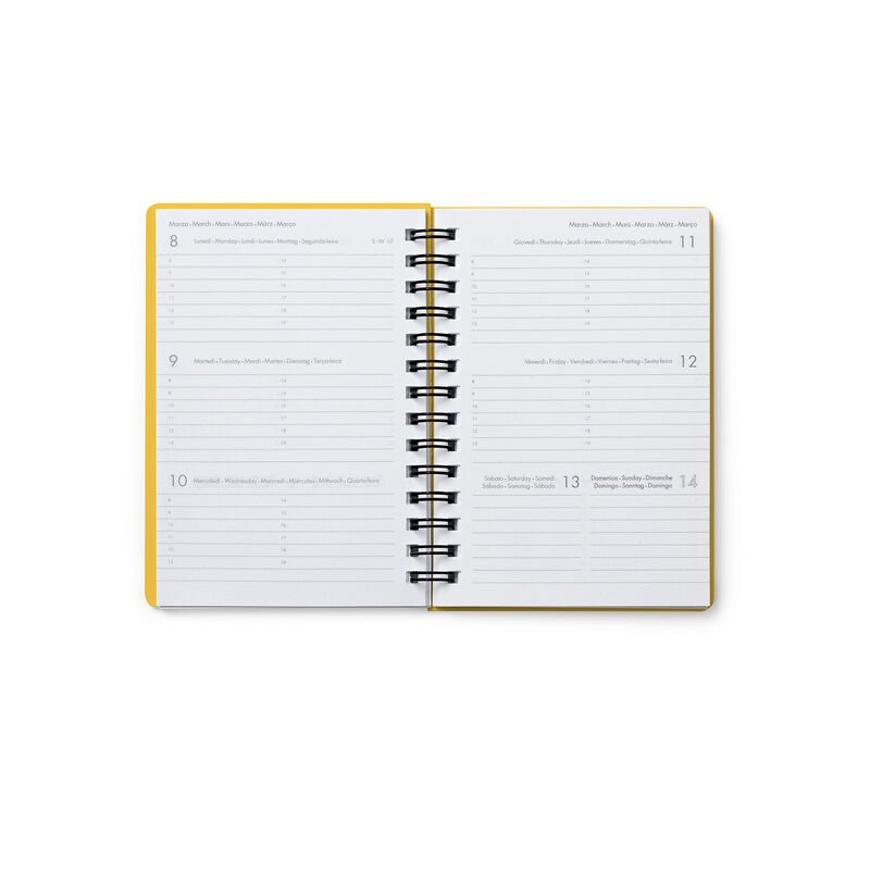 Agenda dispune de închidere cu elastic, legare în spirală și buzunar din PVC în partea din spate pentru diferite documente.
