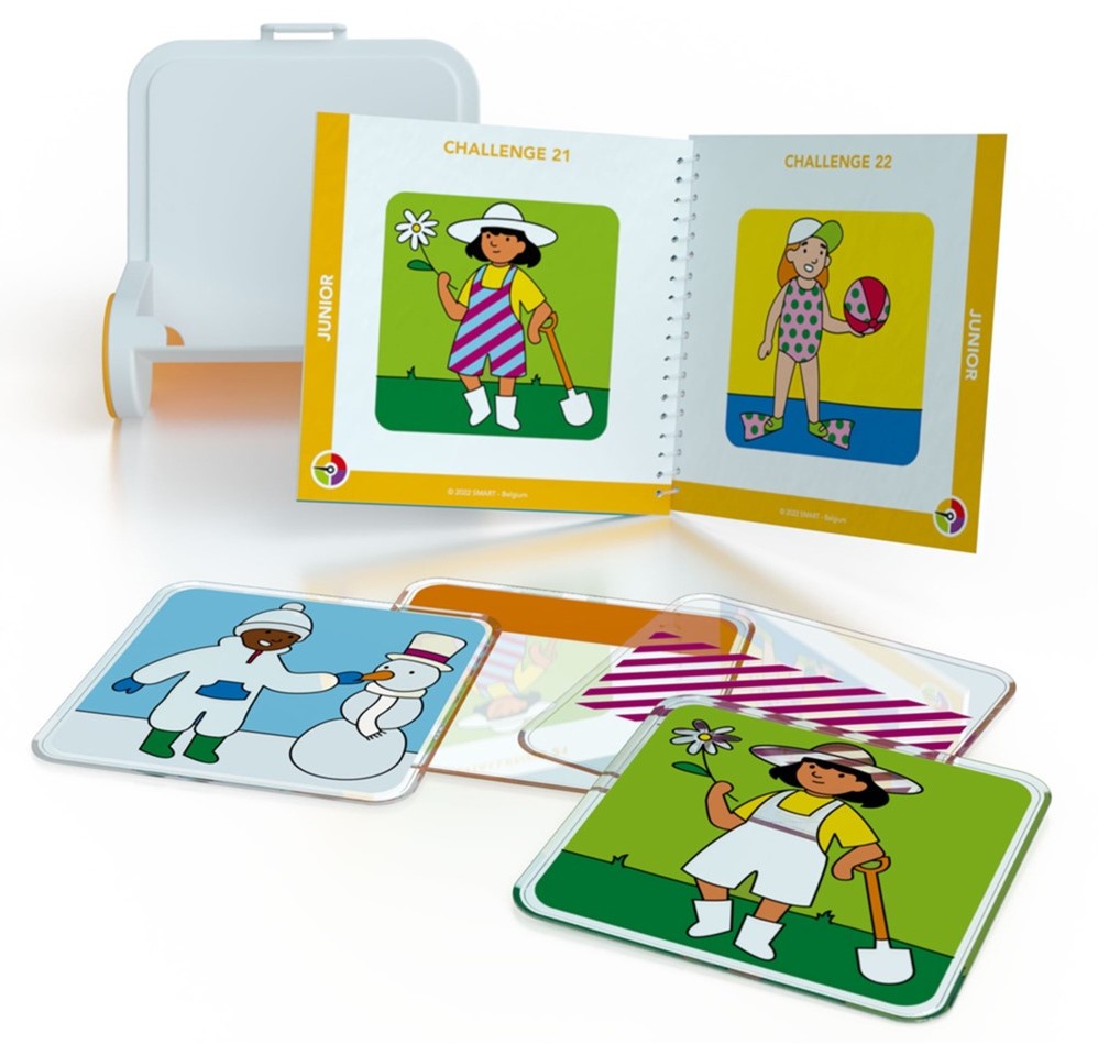 Jocul contine 4 placute cu imaginea unui copil, 8 placute cu forme si texturi colorate, 1 carticica cu 80 de provocari progresive ca dificultate si solutiile lor, o tabla de joc suport pentru placute.