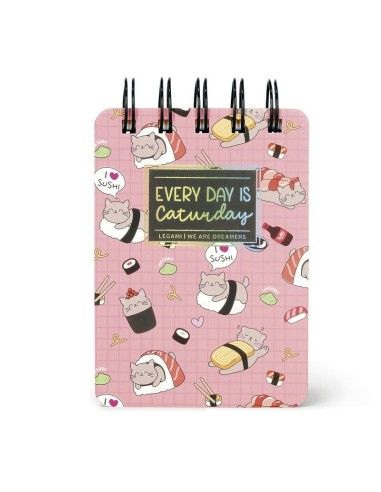 Stai drept, dragă/dragă, cu mini-caietul spiralat Legami Sushi Cat. Dimensiunea sa compactă și partea de sus legată îl fac instrumentul perfect pentru notițe și notițe, oriunde te-ai afla. Hârtia este certificată FSC® (FSC-C154586) și provine din păduri gestionate sustenabil, păduri certificate FSC® și alte surse controlate.