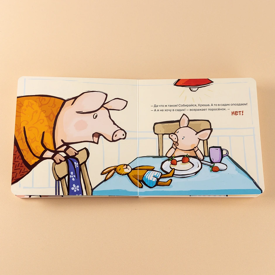 Сегодня у Хрюши Хрюшкина день «НЕТ»: он не хочет вставать, не хочет чистить зубы и завтракать, не хочет одеваться и уж тем более идти в детский садик. Когда Хрюша всё-таки туда приходит, он понимает, что сильно опоздал на завтрак и все ребята вовсю играют.