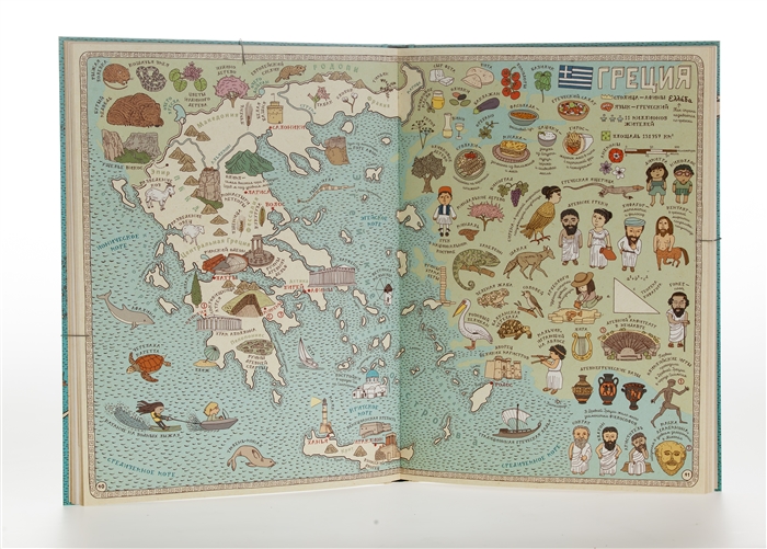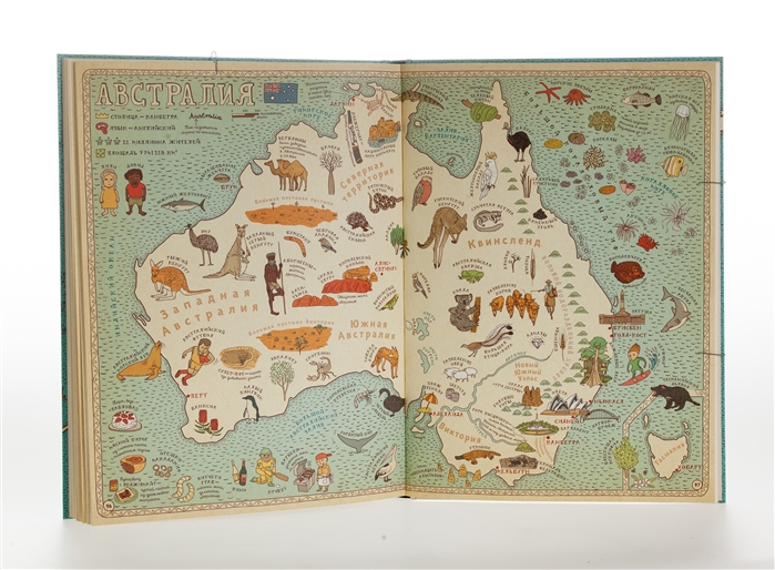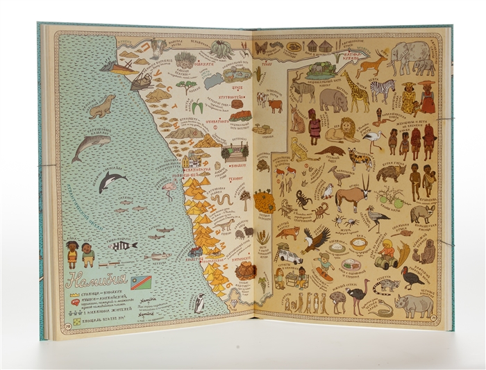 Географическая карта может быть скучным школьным пособием, а может стать и игрой, развивающей воображение, тренирующей память и позволяющей овладевать новыми знаниями. Рисованный атлас «Карты» польских художников Александры и Даниэля Мизелиньских можно уподобить старинным картам мира, на которых картографы помещали много полезных сведений о странах и людях, в них живущих. И с его помощью художники приглашают нас в необычное путешествие вокруг света, которое можно совершить из дома. Четыре тысячи картинок рассказывают о 41 стране: кто в ней живет, какие самые распространенные имена, какие достопримечательности — природные, архитектурные, самые распространенные и самые редкие представители флоры и фауны, обычаи и традиции, исторические персонажи, прославившие свою родину, виды спорта, национальная кухня.