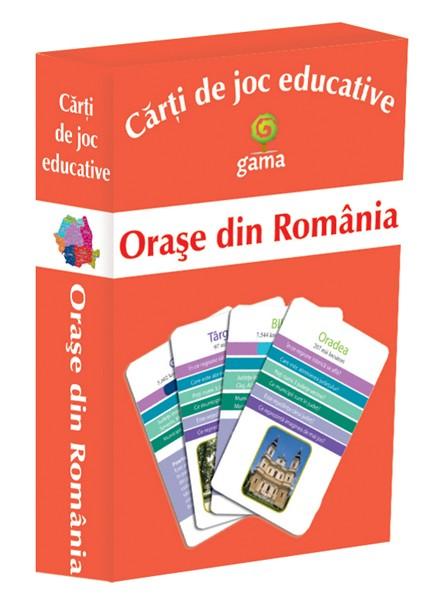 Carti de joc educative - Orase din Romania contine 41 de carti de joc cu judetele si resedintele de judet ale Romaniei, 5 carduri cu intrebari si raspunsuri din arta, inventii, geografie si literatura romana. Jocurile sunt structurate pe grade de dificultate diferite (Stiu si castig, Domino, Stiu regiunile istorice)