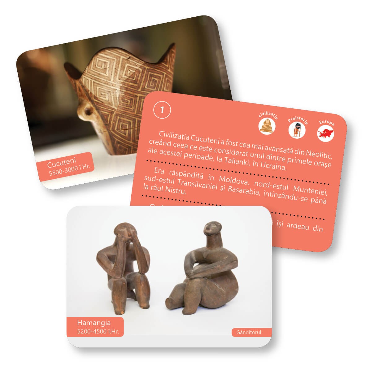 Pachetul oferă o prezentare inedită a celor mai importante civilizații, regate și imperii din istorie. Cardurile stimulează curiozitatea și dorința de a ști mai multe despre civilizațiile de mult apuse, despre imperiile care au dominat lumea și despre unele dintre cele mai important personaje istorice. Acum, aveți la îndemână un material enciclopedic practic, cu informații interesante, imagini extraordinare și pictograme de clasificare, pe care îl puteți folosi în nenumărate activități.