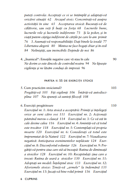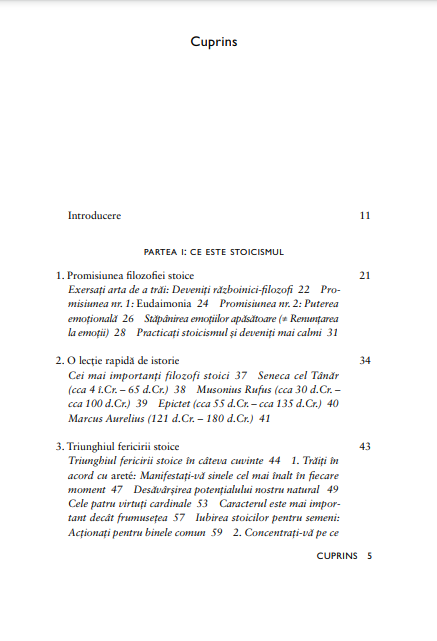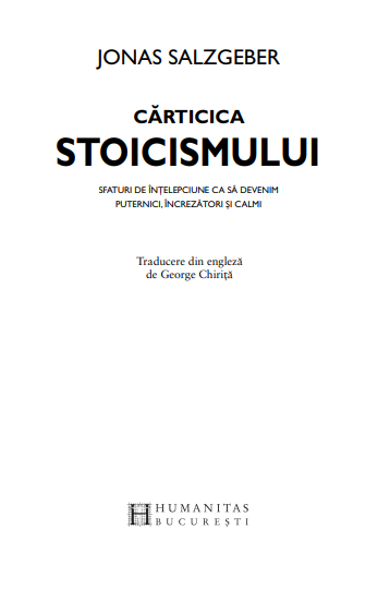 „Ideile si conceptele urmate de stoici in era gladiatorilor care luptau pentru propria viata si a romanilor care se intalneau la terme sunt inca foarte utile in epoca serialului Urzeala tronurilor si a Facebookului. Intelepciunea acestei filozofii antice ramane mereu actuala; valoarea ei in construirea unei vieti fericite si pline de sens este de netagaduit. Aceasta carte va aduce harta comorii. Va prezinta filozofii reprezentativi. Va ofera o imagine de ansamblu, usor de inteles a conceptelor stoice. Va invata principiile de baza. Va pune la dispozitie 55 de exercitii stoice si sugestii pentru aplicarea lor in viata voastra tumultuoasa. Si, cel mai important, va arata cum sa folositi teoria cuprinsa in aceste pagini in traiul de zi cu zi.“ — JONAS SALZGEBER