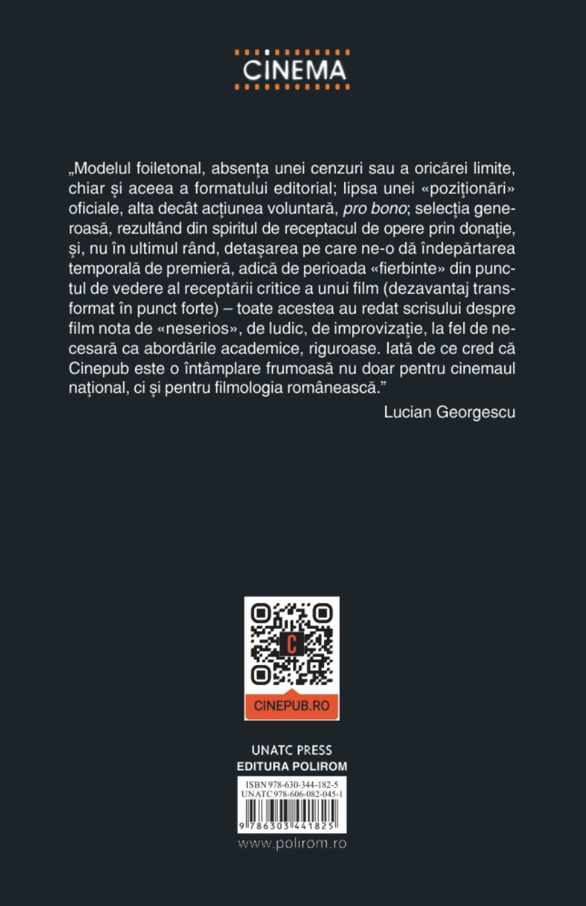 Modelul foiletonal, absența unei cenzuri sau a oricărei limite, chiar și aceea a formatului editorial; lipsa unei «poziționări» oficiale, alta decât acțiunea voluntară, pro bono; selecția generoasă, rezultând din spiritul de receptacul de opere prin donație, și, nu în ultimul rând, detașarea pe care ne-o dă îndepărtarea temporală de premieră, adică de perioada «fierbinte» din punctul de vedere al receptării critice a unui film (dezavantaj transformat în punct forte) – toate acestea au redat scrisului despre film nota de «neserios», de ludic, de improvizație, la fel de necesară ca abordările academice, riguroase. Iată de ce cred că Cinepub este o întâmplare frumoasă nu doar pentru cinemaul național, ci și pentru filmologia românească. (Lucian Georgescu)