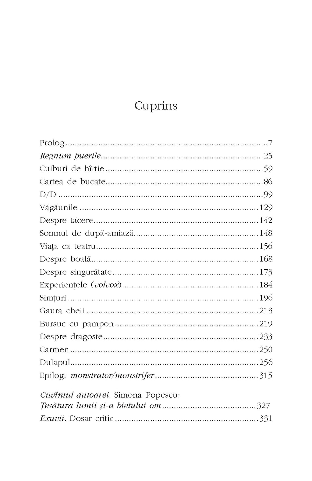 Enigmaticul titlu al cărţii spune, într-un fel, totul: căci „exuviile” sînt pieile lepădate, carcasele subţiri lăsate în urmă de fluturi atunci cînd ies din pupe, învelişurile năpîrlite ale vietăţilor care, crescînd, se transformă cu totul. La fel facem şi noi cu ipostazele noastre vechi, infantile, imature, pe care le îngropăm în uitare. Simona Popescu, ea, nu poate şi nu vrea să le abandoneze: le strînge, le colecţionează, le suprapune într-un timp prezent care, ca într-o sincronie perpetuă, adună toate vîrstele precedente la un loc. Credinţa ei este că psihologia individuală, identitatea, personalitatea îşi pierd consistenţa dacă renunţă la paşii anteriori. Nu sîntem doar ce sîntem, ci şi ce am fost. Iar adevăratele abisuri ale fiinţei se ascund în trecut, în experienţele înstrăinate ale avatarilor care ne-au purtat numele.