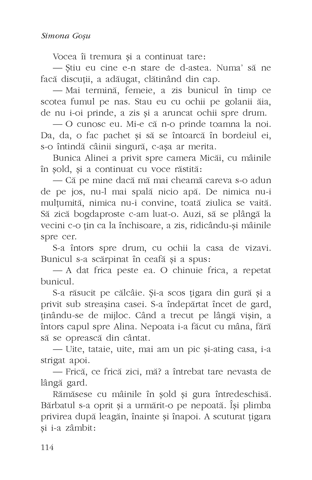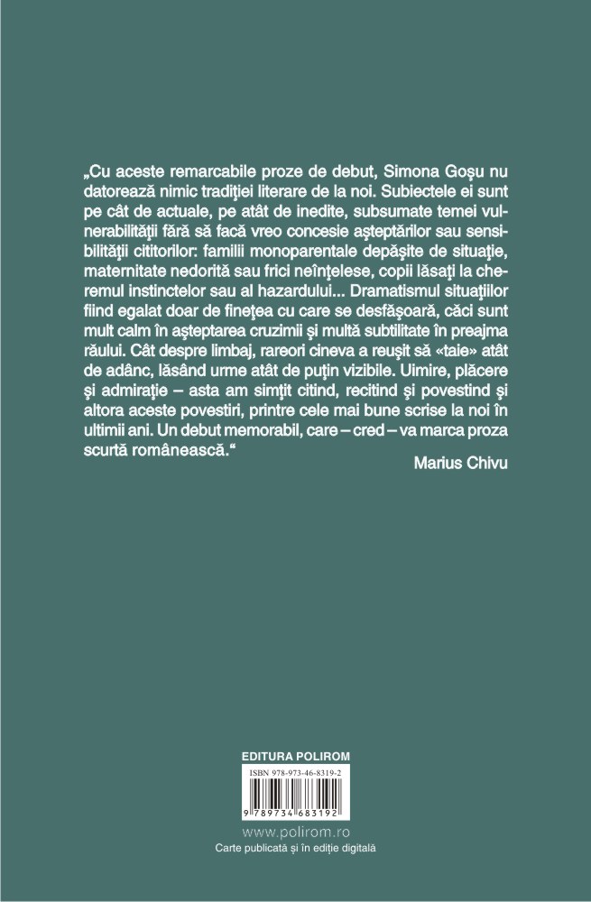 „Cu aceste remarcabile proze de debut, Simona Goșu nu datorează nimic tradiției literare de la noi. Subiectele ei sînt pe cît de actuale, pe atît de inedite, subsumate temei vulnerabilității fără să facă vreo concesie așteptărilor sau sensibilității cititorilor: familii monoparentale depășite de situație, maternitate nedorită sau frici neînțelese, copii lăsați la cheremul instinctelor sau al hazardului... Dramatismul situațiilor fiind egalat doar de finețea cu care se desfășoară, căci sînt mult calm în așteptarea cruzimii și multă subtilitate în preajma răului. Cît despre limbaj, rareori cineva a reușit să «taie» atît de adînc, lăsînd urme atît de puțin vizibile. Uimire, plăcere și admirație – asta am simțit citind, recitind și povestind și altora aceste povestiri, printre cele mai bune scrise la noi în ultimii ani. Un debut memorabil, care – cred – va marca proza scurtă românească.” (Marius Chivu)