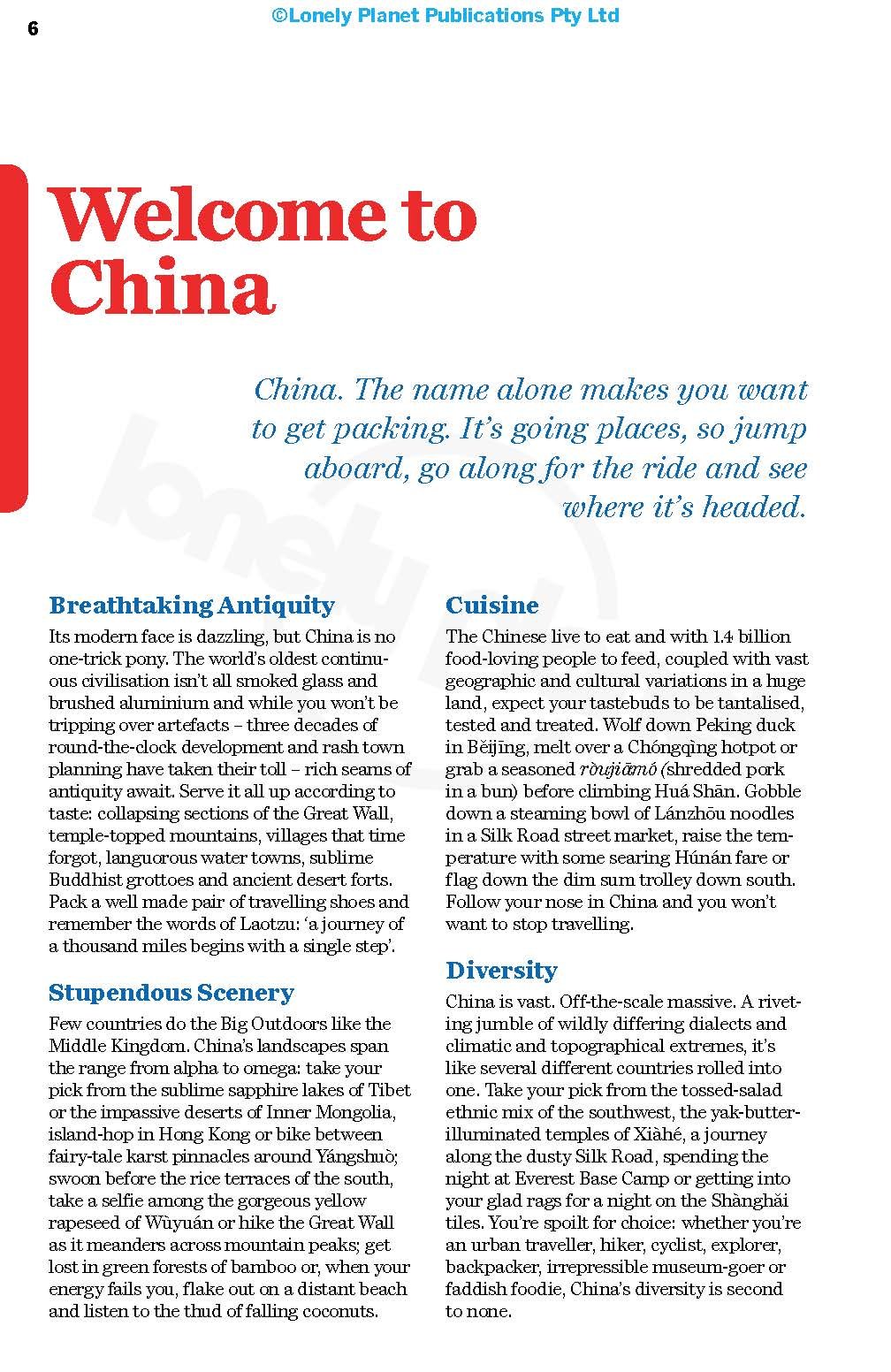 The Perfect Choice: Lonely Planet China , our most comprehensive guide to China, is perfect for both exploring top sights and taking roads less travelled.