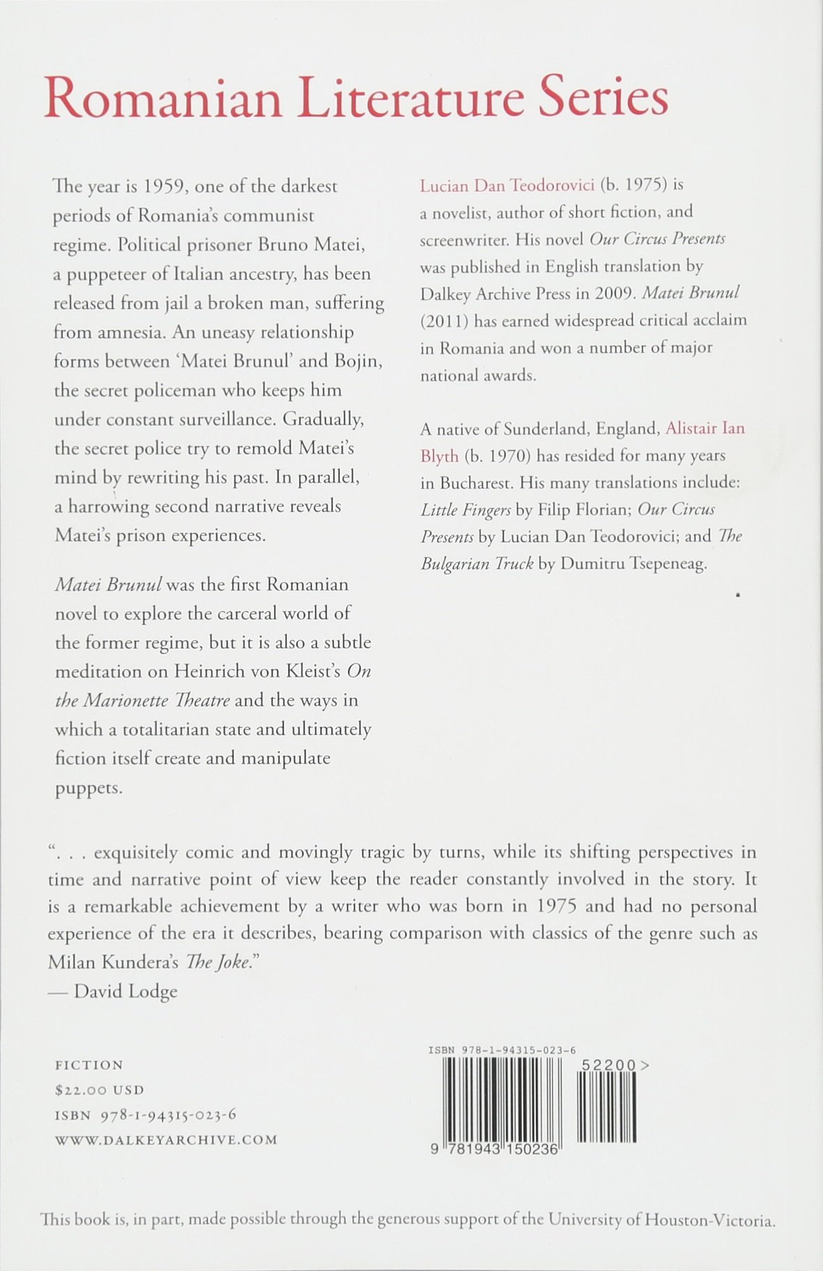 The year is 1959, one of the darkest periods of Romania's communist regime. Political prisoner Bruno Matei, a puppeteer of Italian ancestry, has been released from jail a broken man, suffering from amnesia. An uneasy relationship forms between 'Matei Brunul' and Bojin, the secret policeman who keeps him under constant surveillance. Gradually, the secret police will try to remould Matei's mind by rewriting his past, turning the puppeteer into a puppet of the new totalitarian order. In parallel, a harrowing second narrative reveals Matei's prison experiences: the story of an innocent man physically and mentally crushed by the totalitarian system, which explodes the manipulative fictions of the secret police one by one. Matei Brunul was the first Romanian novel to explore the carceral world of the former regime, but it is also a subtle meditation on Heinrich von Kleist's On the Marionette Theatre and the ways in which a totalitarian state and ultimately fiction itself create and manipulate puppets.
