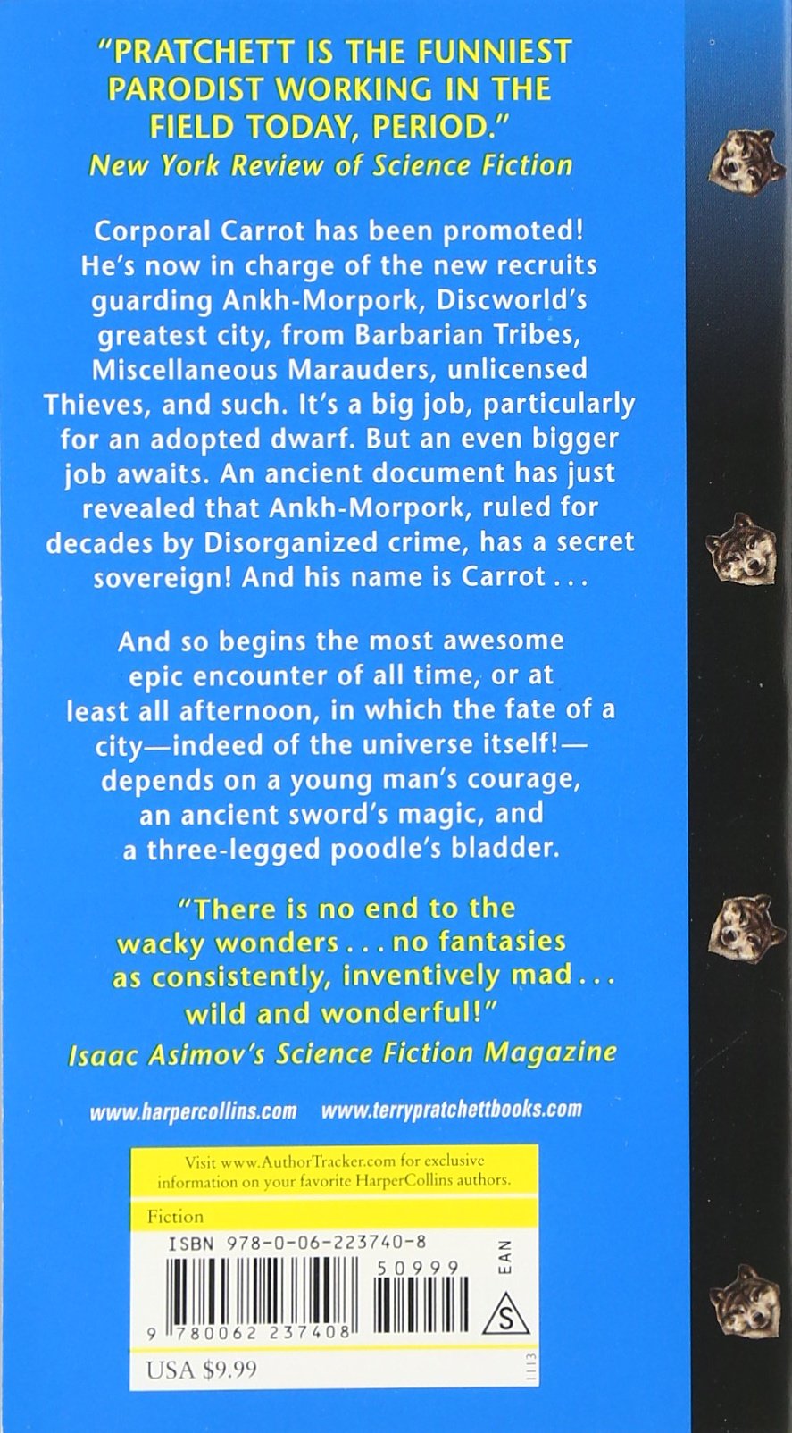 Corporal Carrot has been promoted! He's now in charge of the new recruits guarding Ankh-Morpork, Discworld's greatest city, from Barbarian Tribes, Miscellaneous Marauders, unlicensed Thieves, and such. It's a big job, particularly for an adopted dwarf. But an even bigger job awaits. An ancient document has just revealed that Ankh-Morpork, ruled for decades by Disorganized crime, has a secret sovereign! And his name is Carrot . . .