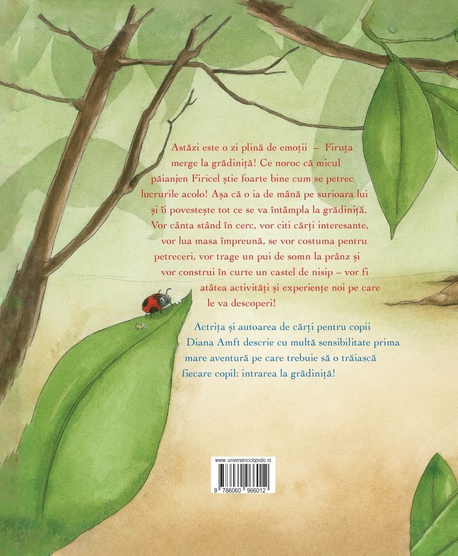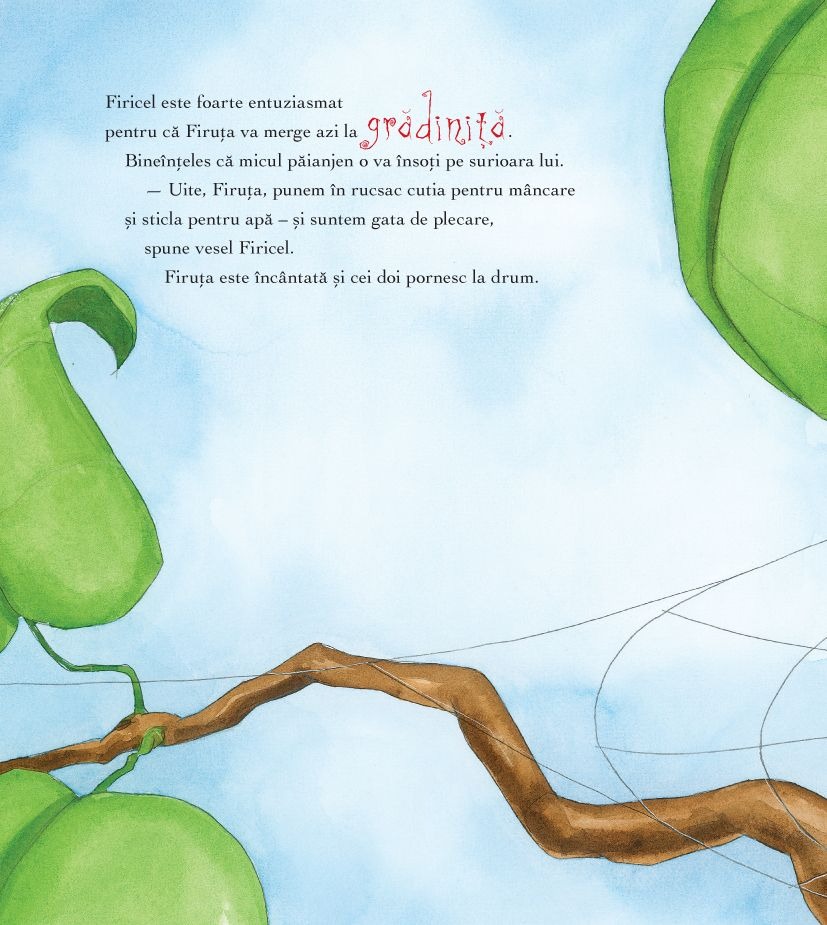 Ce noroc că micul păianjen Firicel știe foarte bine cum se petrec lucrurile acolo! Așa că o ia de mână pe surioara lui și îi povestește tot ce se va întâmpla la grădiniță. Vor cânta stând în cerc, vor citi cărți interesante, vor lua masa împreună, se vor costuma pentru petreceri, vor trage un pui de somn la prânz și vor construi în curte un castel de nisip – vor fi atâtea activități și experiențe noi pe care le va descoperi!