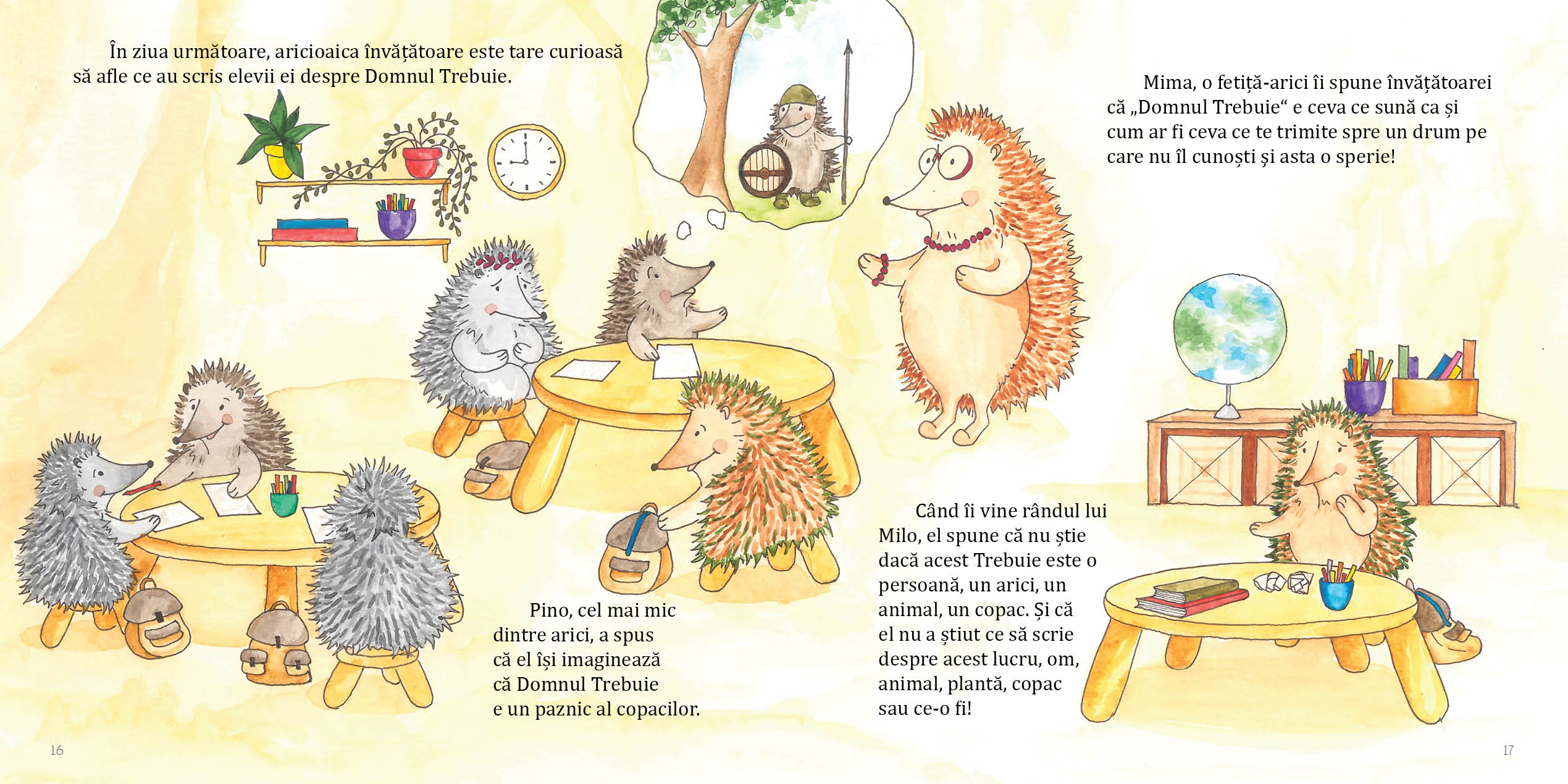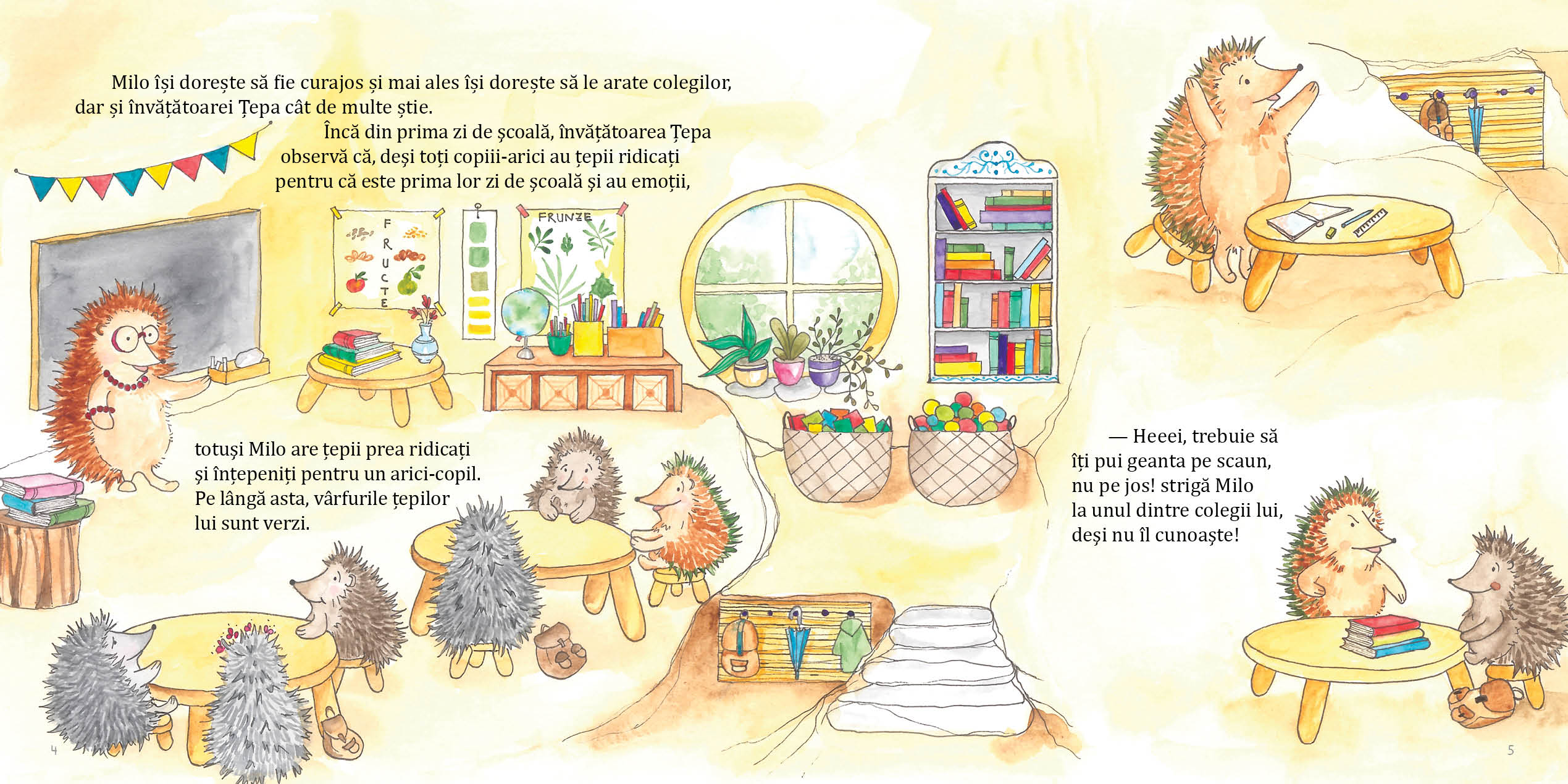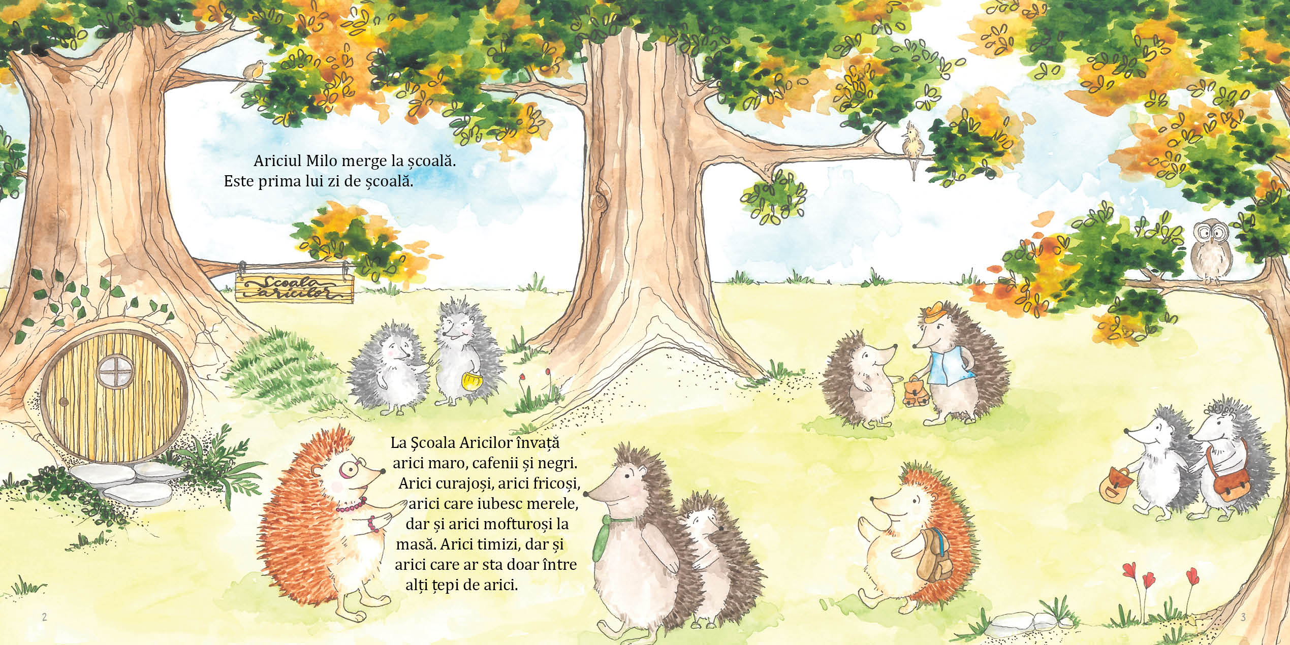 Povestea ariciului Milo ne ajută să discutăm într-un mod jucăuș cu copiii despre adaptare, disconfort, teama de necunoscut și, nu în ultimul rând, despre iubire. Milo își înțelege emoțiile și reușește să se simtă mai bine cu ceea ce simte, cu învățătoarea și cu ceilalți arici.