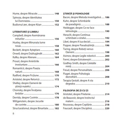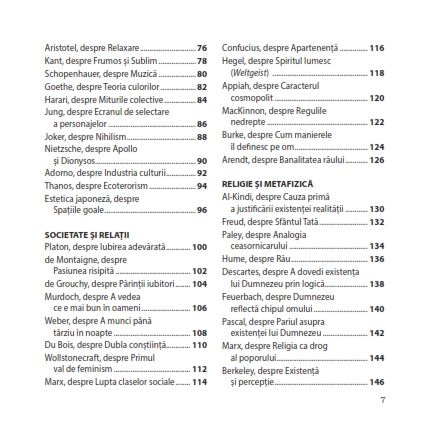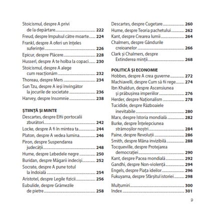 Abordând toate temele, de la strategia lui Sun Tzu pe care o putem aplica în jocurile de societate, până la perspectiva lui Freud despre „impulsul nostru către moarte”; de la motivul pentru care Simone de Beauvoir credea că instinctul matern este un mit, până la de ce Schopenhauer nu era prea amuzant la petreceri, aceste mini-meditații scot filosofia din turnul său de fildeș, ajutându-te astfel să-ți dezvolți mintea și să-ți lărgești viziunea.