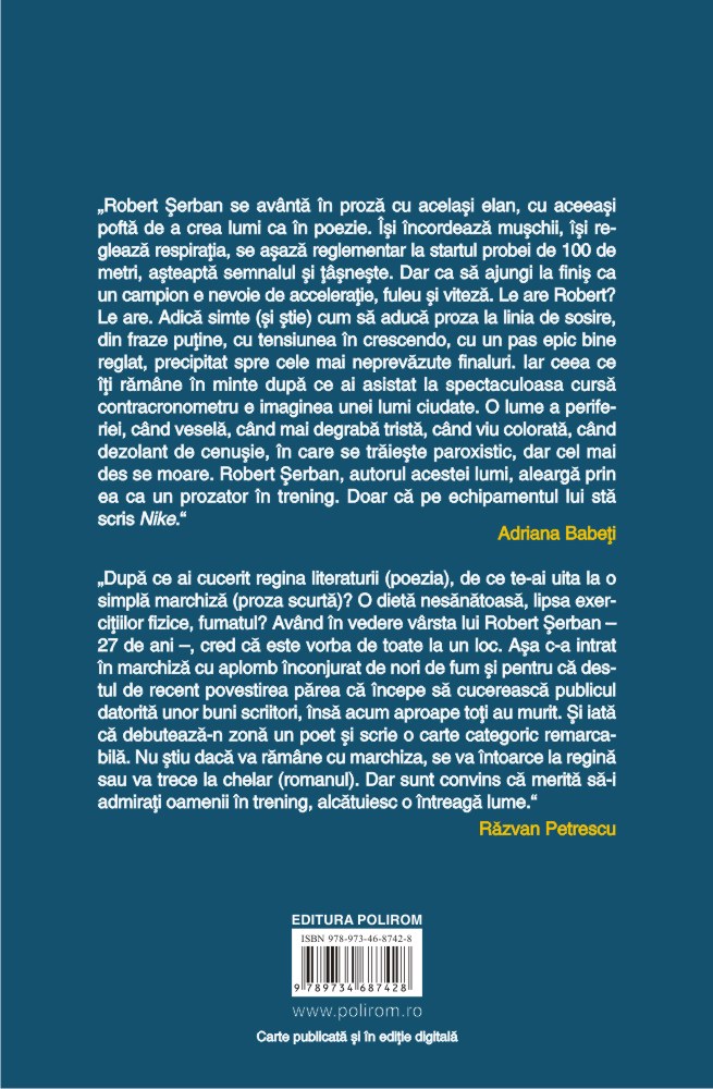 „Robert Șerban se avântă în proză cu același elan, cu aceeași poftă de a crea lumi ca în poezie. Își încordează mușchii, își reglează respirația, se așază reglementar la startul probei de 100 de metri, așteaptă semnalul și țâșnește. Dar ca să ajungi la finiș ca un campion e nevoie de accelerație, fuleu și viteză. Le are Robert? Le are. Adică simte (și știe) cum să aducă proza la linia de sosire, din fraze puține, cu tensiunea în crescendo, cu un pas epic bine reglat, precipitat spre cele mai neprevăzute finaluri. Iar ceea ce îți rămâne în minte după ce ai asistat la spectaculoasa cursă contracronometru e imaginea unei lumi ciudate. O lume a periferiei, când veselă, când mai degrabă tristă, când viu colorată, când dezolant de cenușie, în care se trăiește paroxistic, dar cel mai des se moare. Robert Șerban, autorul acestei lumi, aleargă prin ea ca un prozator în trening. Doar că pe echipamentul lui stă scris Nike.” (Adriana Babeți)