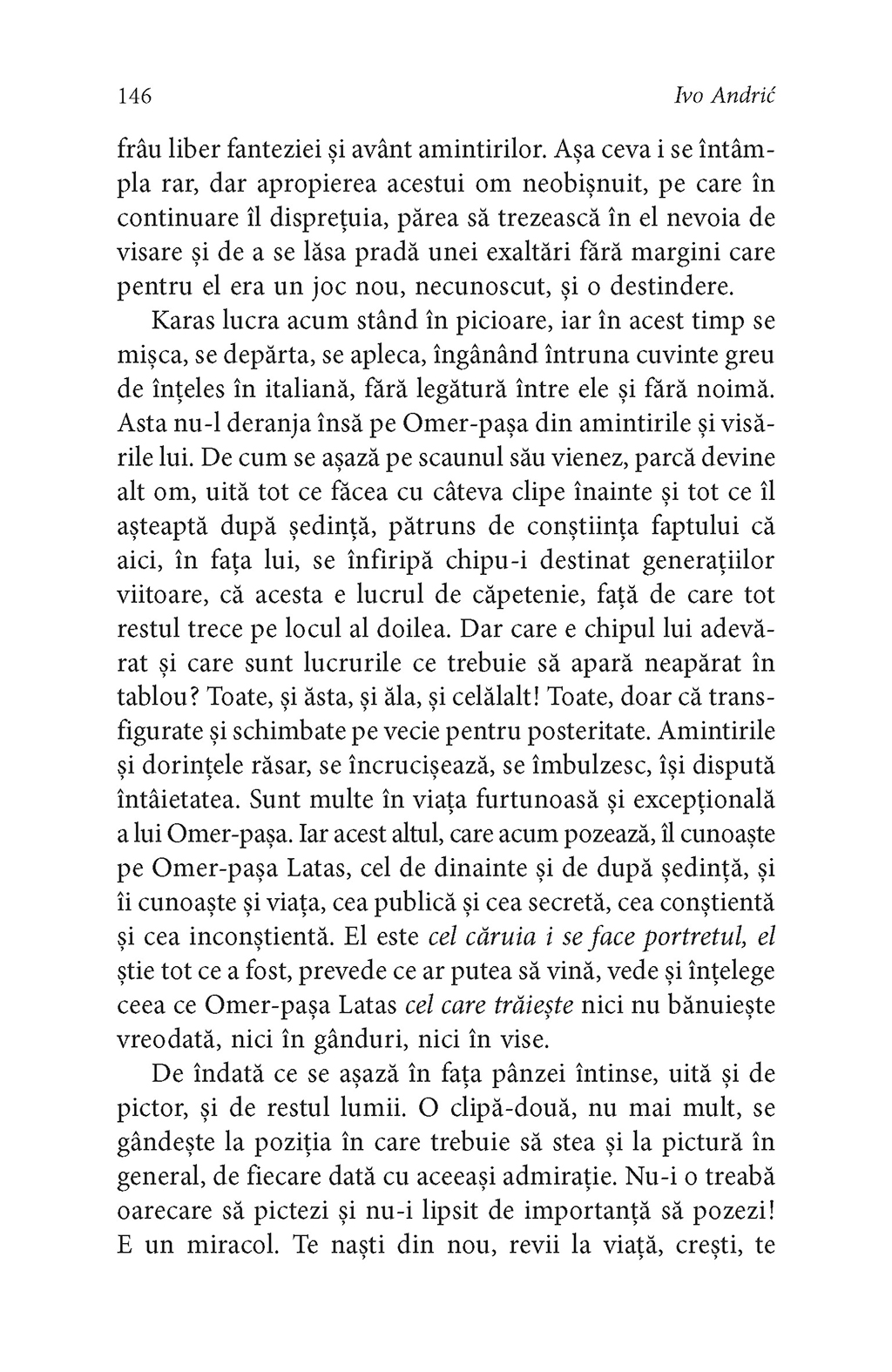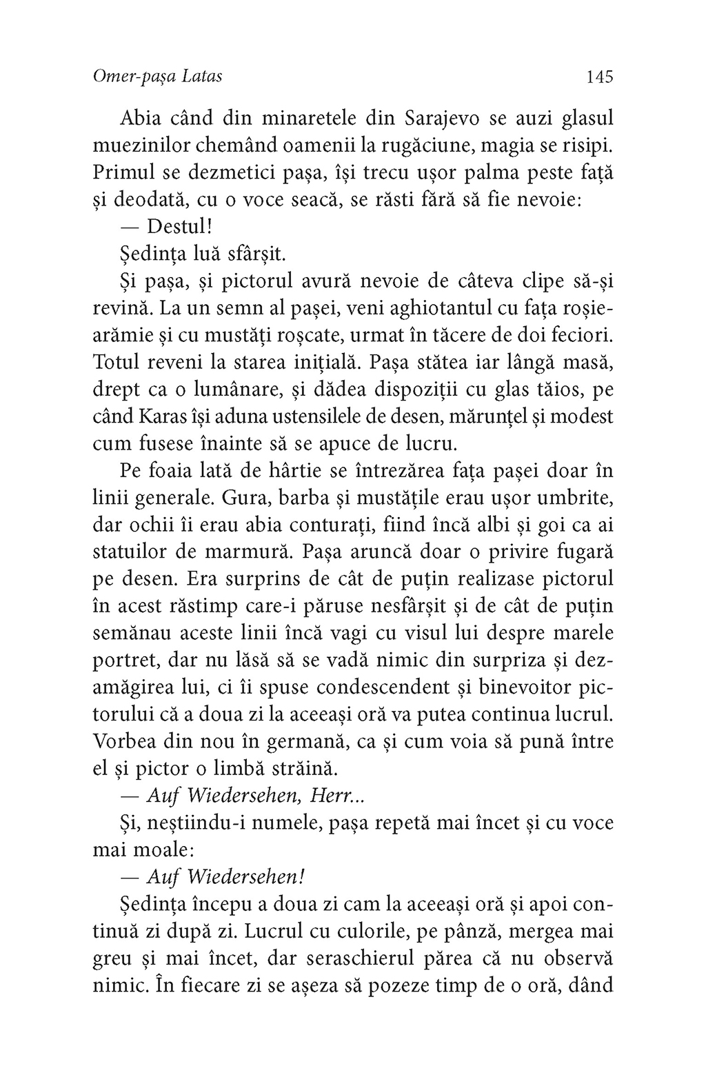 „...Iar apoi – pe un cal alb cu hăţurile aurite şi ciucuri roşii, într-o uniformă verde-închis, brodată cu aur, zvelt şi parcă turnat – seraschierul Omer-paşa. Semăna puţin cu o nălucă, una neaşteptat de blândă şi de binevoitoare. De parcă nu călărea, ci plutea pe un nor. Uimită şi plină de admiraţie, mulţimea vedea, necrezându-şi ochilor, cum licărul soarelui la asfinţit îi cade pe piept şi îi luminează faţa cu barba uşor încărunţită şi cu o expresie de demnitate gravă şi de blândeţe enigmatică.”