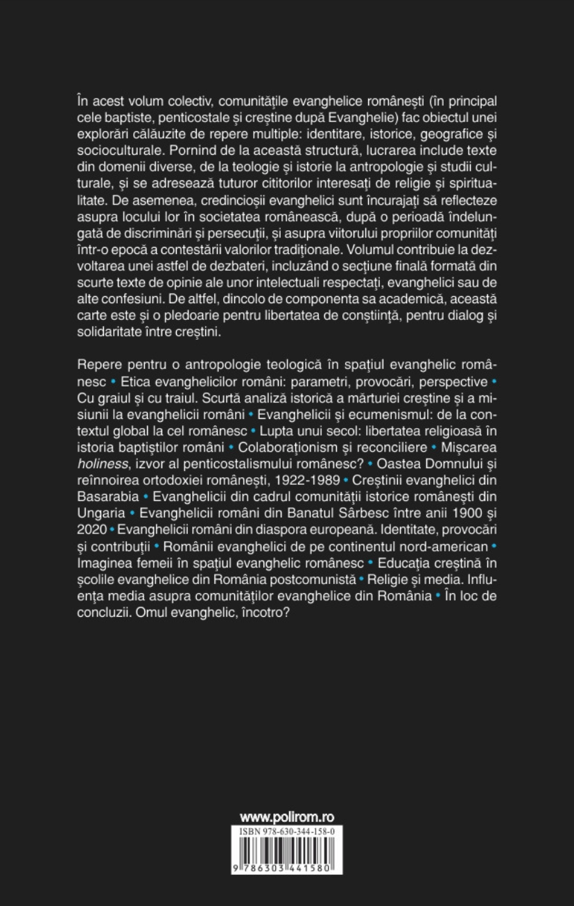 În acest volum colectiv, comunitățile evanghelice românești (în principal cele baptiste, penticostale și creștine după Evanghelie) fac obiectul unei explorări călăuzite de repere multiple: identitare, istorice, geografice și socioculturale.