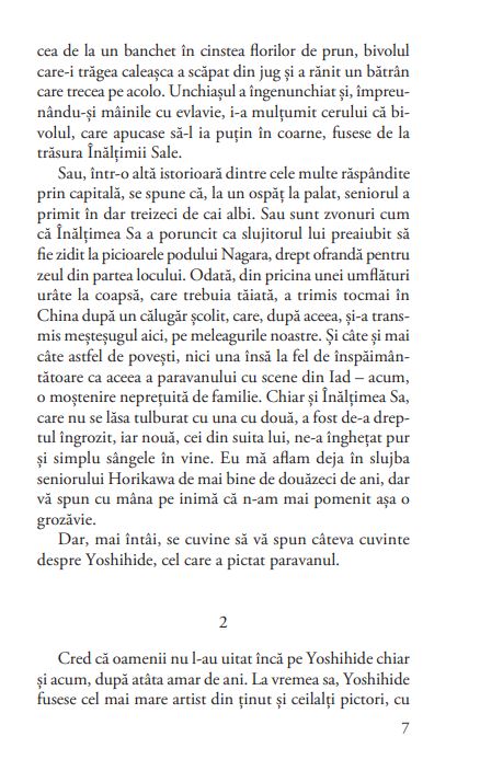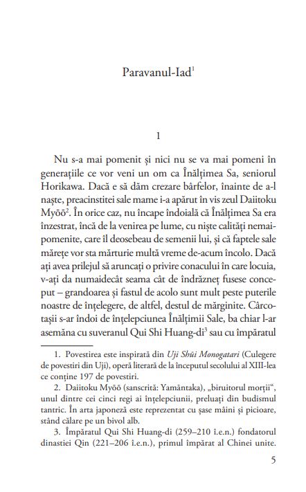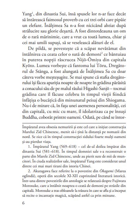 La începutul secolului XX, Ryūnosuke Akutagawa uimește lumea artistică japoneză cu imensul său talent literar, atrăgându-și titlul de „părintele prozei scurte japoneze moderne“. Volumul de față reunește douăzeci de povestiri cu o largă paletă tematică, traduse pentru prima dată în limba română, ce dovedesc geniul lui Akutagawa de a scrie literatură în filigran și de a se poziționa permanent în vecinătatea bizarului. Akutagawa, care reușește să creeze microcapodopere inspirate din tradiții literare diverse, își invită cititorul să pășească în Japonia medievală (Prințesa Roku no Miya, Kesa și Moritō, Nasul), în perioada Restaurației Meiji, când Orientul întâlnește Occidentul (Balul) și, nu în ultimul rând, în Japonia contemporană lui (Roți zimțate, O poveste ciudată).