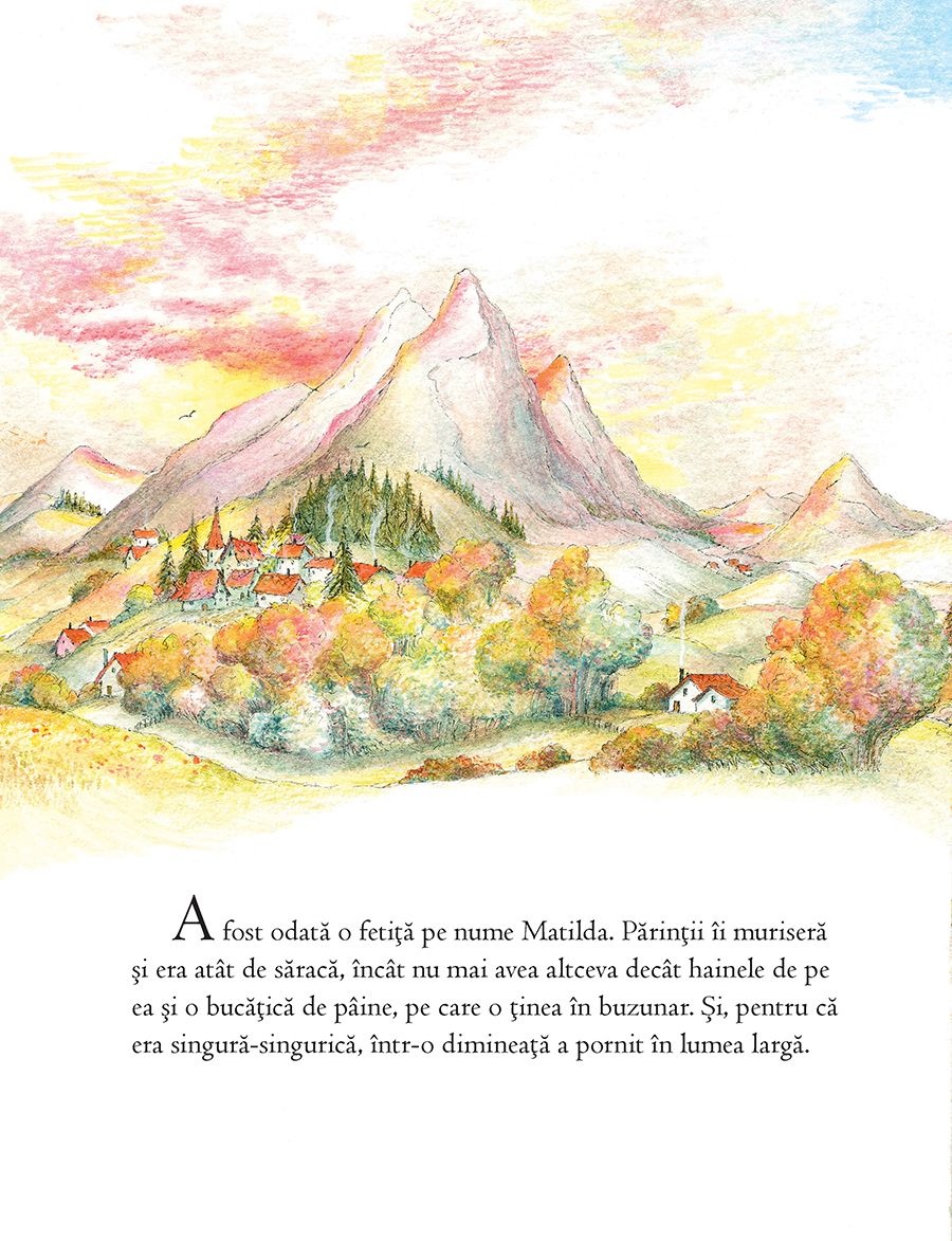 O fetiţă orfană pe nume Matilda îşi dă şi ultima cămaşă de pe ea. Acum a rămas să tremure de frig în noaptea rece. Dar cei care fac bine sunt răsplătiţi întotdeauna pentru generozitatea lor. Cunoscutul basm al fraţilor Grimm, repovestit şi ilustrat cu multă sensibilitate de Bernadette. O poveste emoţionantă despre ce înseamnă să dăruieşti, despre binele pe care-l facem celor pe care îi întâlnim şi despre răsplata pe care o primesc cei care îşi păstrează inima bună şi curată.