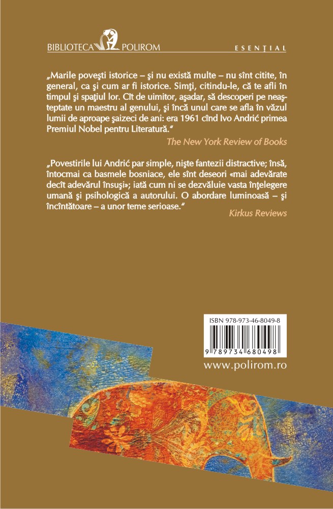 „Marile poveşti istorice – şi nu există multe – nu sînt citite, în general, ca şi cum ar fi istorice. Simţi, citindu-le, că te afli în timpul şi spaţiul lor. Cît de uimitor, aşadar, să descoperi pe neaşteptate un maestru al genului, şi încă unul care se afla în văzul lumii de aproape şaizeci de ani: era 1961 cînd Ivo Andrić primea Premiul Nobel pentru Literatură.” (The New York Review of Books)