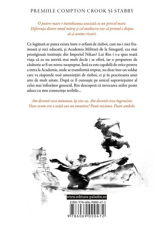 Ce legătură ar putea exista între o orfană de război, care nu-i nici frumoasă și nici educată, și Academia Militară de la Sinegard, cea mai prestigioasă instituție din Imperiul Nikan? Lui Rin i s-a spus toată viața că ea nu merită mai mult decât i se oferă, iar o propunere de căsătorie ar fi un noroc neașteptat. Însă ea este capabilă de orice pentru a intra la Academie, unde se transformă treptat, nu doar într-un soldat care va răspunde noii amenințări de război, ci și în practicanta unei arte de mult uitate. După ce îl cunoaște pe unicul supraviețuitor al celui mai înfiorător genocid, Rin descoperă că invocarea zeilor poate aduce cu sine consecințe teribile…