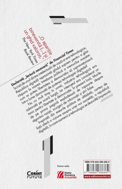 Jamie Susskind arată ce influență au IA, Big Data și rețelele sociale asupra politicii și societății. Inspirându-se din eseurile politice ale marilor gânditori ai lumii, el creionează o nouă viziune, bazată pe noi standarde legale, organisme publice și instituții, obligații și platforme, drepturi și reglementări, și noi coduri de conduită pentru cei care lucrează în domeniu. Cartea sa este un manifest strălucit și un proiect revoluționar pentru o altfel de societate: o republică digitală, în care omul și tehnologia se dezvoltă împreună.