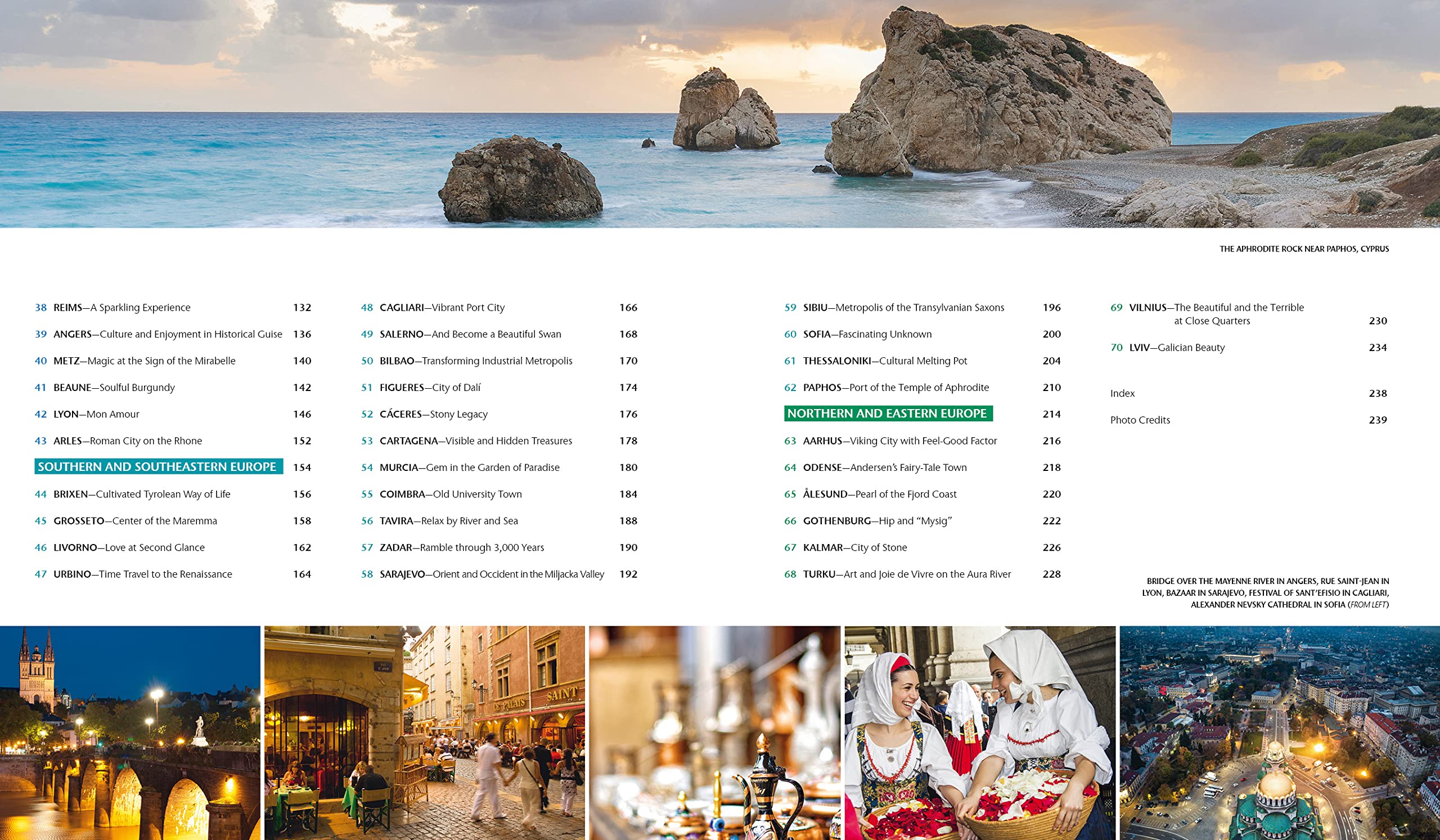Get an insider's look at 70 beautiful, charming European cities that you may not have heard of. Kufstein, Lugano, Wroclaw ... enchanting, unique, and all-but-hidden urban beauties of Europe, where you can stroll and marvel undisturbed. Lush photos and informative text bring to life cities like Salerno, Italy, with its medieval Old Town; Paphos, Cyprus, with its romantic beaches; Alkmaar, Holland, with its cosy cafes; or the flourishing port city of Turku in Finland. Divided by region -- central Europe, western Europe, southern and south-eastern Europe, and north and eastern Europe -- this guide will help you choose your next getaway away from the crowds. Go on a journey of discovery!