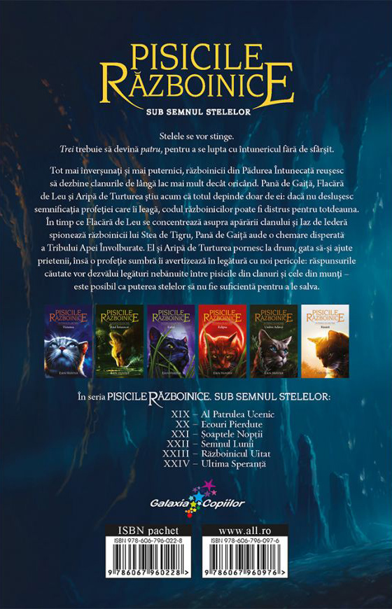 Flacără de Leu se concentrează asupra apărării clanului. Iaz de Iederă spionează războinicii lui Stea de Tigru. Între timp, Pană de Gaiță a pornit la drum alături de Aripă de Turturea, în urma chemării disperate a prietenilor din Tribul Apei Învolburate. Dar o profeție sumbră îi avertizează despre alte pericole care le dau târcoale. Ies la iveală legături nebănuite între pisicile din clanuri și cele din munți. În acest context, este posibil ca puterea stelelor să nu fie suficientă pentru a le salva...