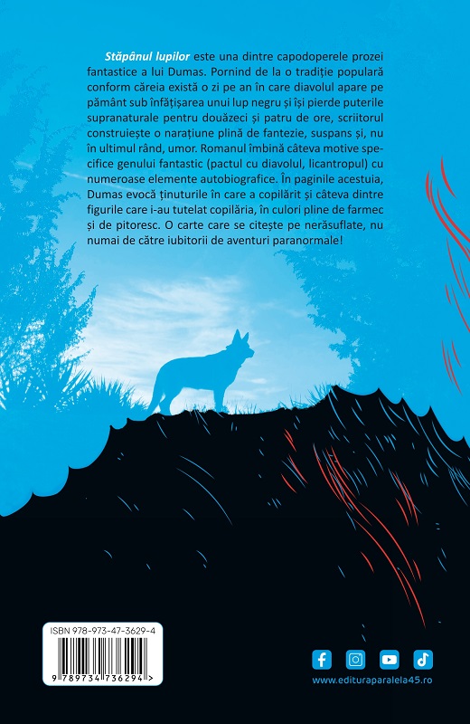 Stăpânul lupilor este una dintre capodoperele prozei fantastice a lui Dumas. Pornind de la o tradiție populară conform căreia există o zi pe an în care diavolul apare pe pământ sub înfățișarea unui lup negru și își pierde puterile supranaturale pentru douăzeci și patru de ore, scriitorul construiește o narațiune plină de fantezie, suspans și, nu în ultimul rând, umor. Romanul îmbină câteva motive specifice genului fantastic (pactul cu diavolul, licantropul) cu numeroase elemente autobiografice. În paginile lui, Dumas evocă ținuturile în care a copilărit și câteva dintre figurile care i-au tutelat copilăria, în culori pline de farmec și pitoresc. O carte care se citește pe nerăsuflate, nu numai de către iubitorii de aventuri paranormale!