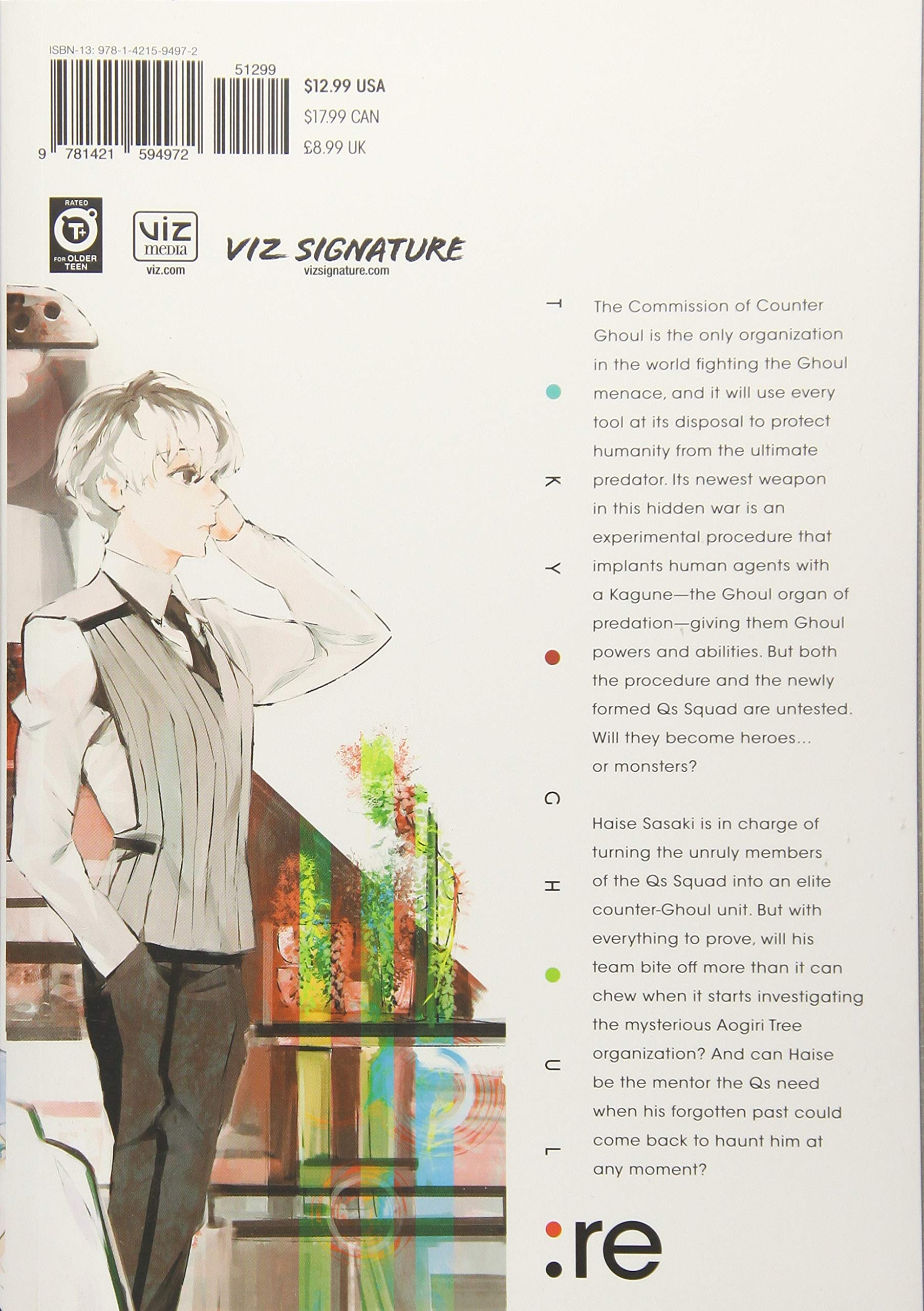 Haise Sasaki is in charge of turning the unruly members of the Qs Squad into an elite counter-Ghoul unit. But with everything to prove, will his team bite off more than it can chew when it starts investigating the mysterious organization Aogiri Tree? And can Haise be the mentor the Qs need when his forgotten past could come back to haunt him at any moment?