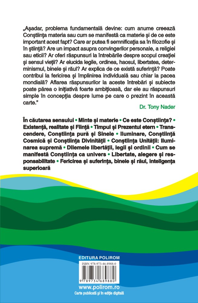 „Așadar, problema fundamentală devine: cum anume creează Conștiința materia sau cum se manifestă ca materie și de ce este important acest fapt? Care ar putea fi semnificația sa în filozofie și în știință? Are un impact asupra convingerilor personale, a religiei sau eticii? Ar oferi răspunsuri la întrebările despre scopul creației și sensul vieții? Ar elucida legile, ordinea, haosul, libertatea, determinismul, binele și răul? Ar explica de ce există suferință? Poate contribui la fericirea și împlinirea individuală sau chiar la pacea mondială? Aflarea răspunsurilor la aceste întrebări și subiecte poate părea o inițiativă foarte ambițioasă, dar ele au răspunsuri simple în concepția despre lume pe care o prezint în această carte.” (Dr. Tony Nader)
