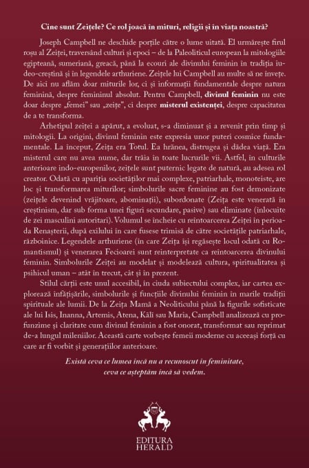 Joseph Campbell ne deschide portile catre o lume uitata. El urmareste firul rosu al Zeitei, traversand culturi si epoci – de la Paleoliticul european la mitologiile egipteana, sumeriana, greaca, pana la ecouri ale divinului feminin in traditia iudeo-crestina si in legendele arthuriene. Zeitele lui Campbell au multe sa ne invete. De aici nu aflam doar miturile lor, ci si informatii fundamentale despre natura feminina, despre femininul absolut. Pentru Campbell, divinul feminin nu este doar despre „femei” sau „zeite”, ci despre misterul existentei, despre capacitatea de a te transforma.
