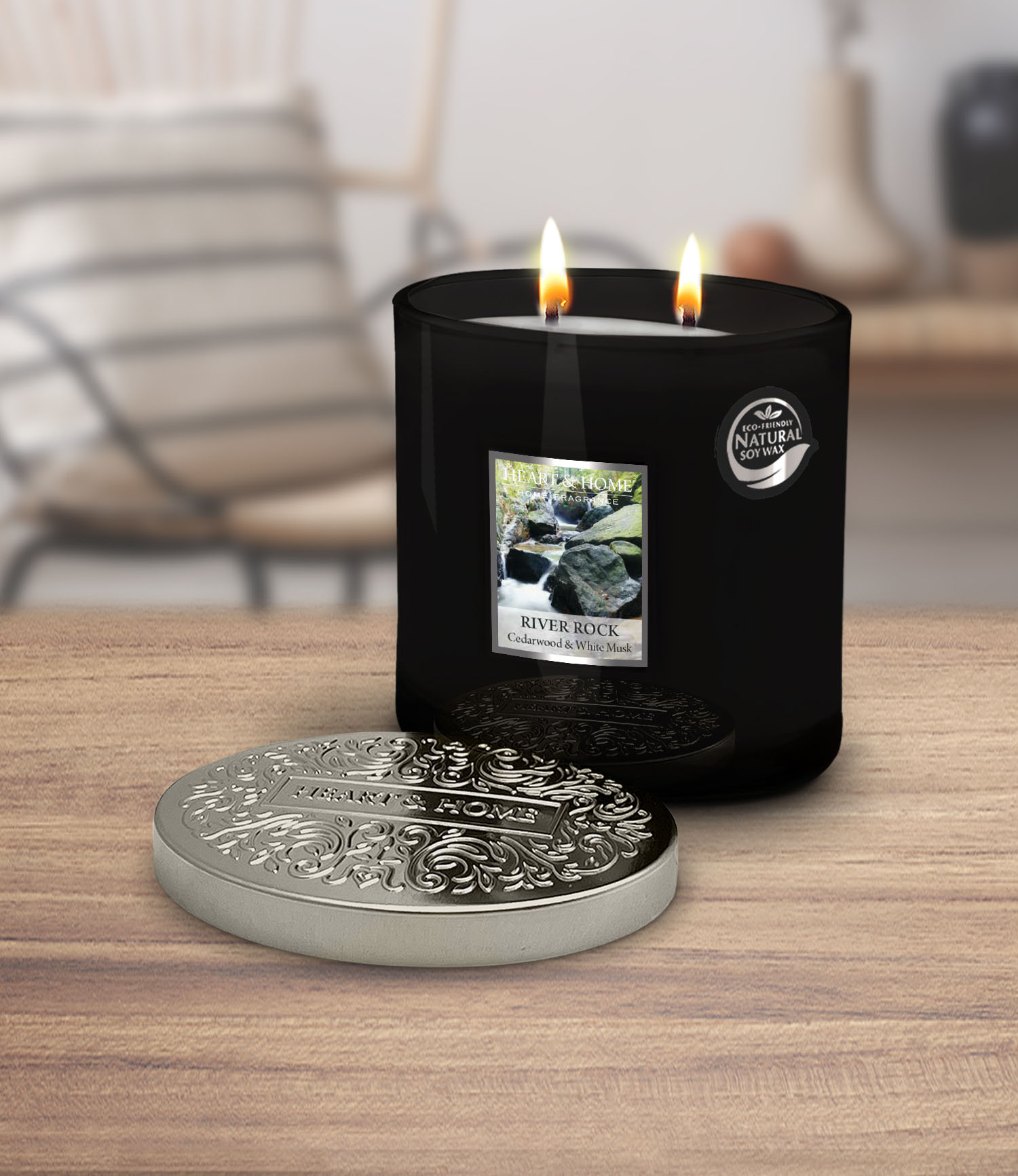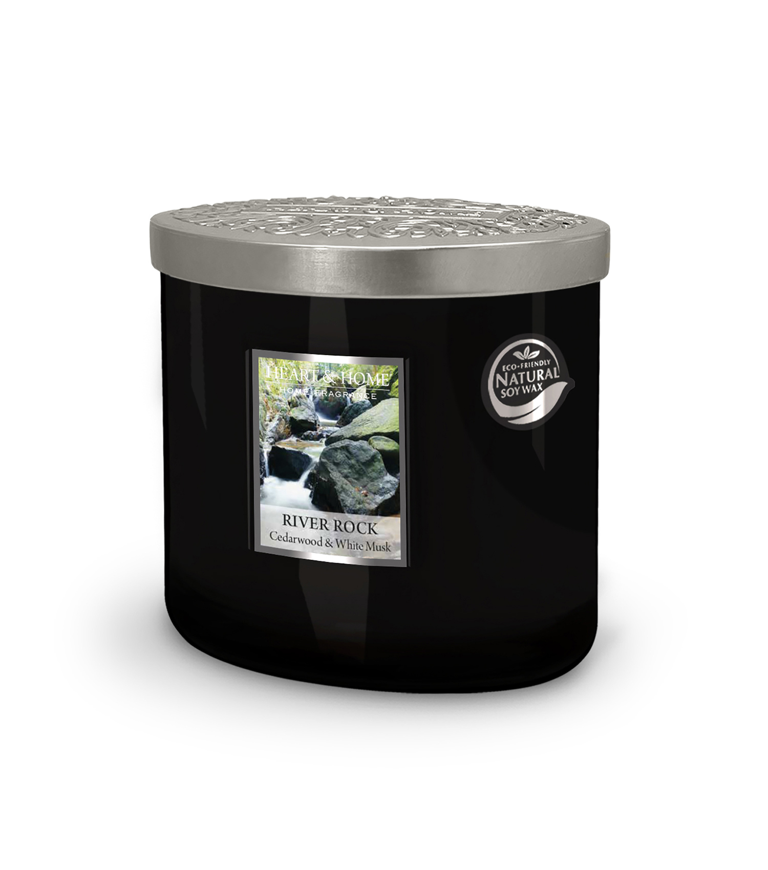 Lumânare River Rock de la Heart and Home Twin Wick Elipse cu un parfum lemnos intrigant.