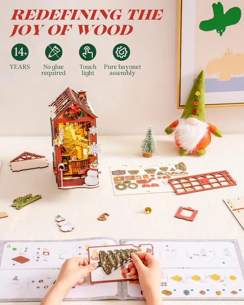 - Experiență de bricolaj imersivă - Bucurați-vă de procesul creativ de asamblare a acestei mini case cu tematică de Crăciun. Cu piese din lemn tăiate cu laser, asigură o experiență de asamblare fără cusur. De la lumini sclipitoare la decorațiuni vesele, fiecare pas este o călătorie încântătoare în lumea magiei Crăciunului.