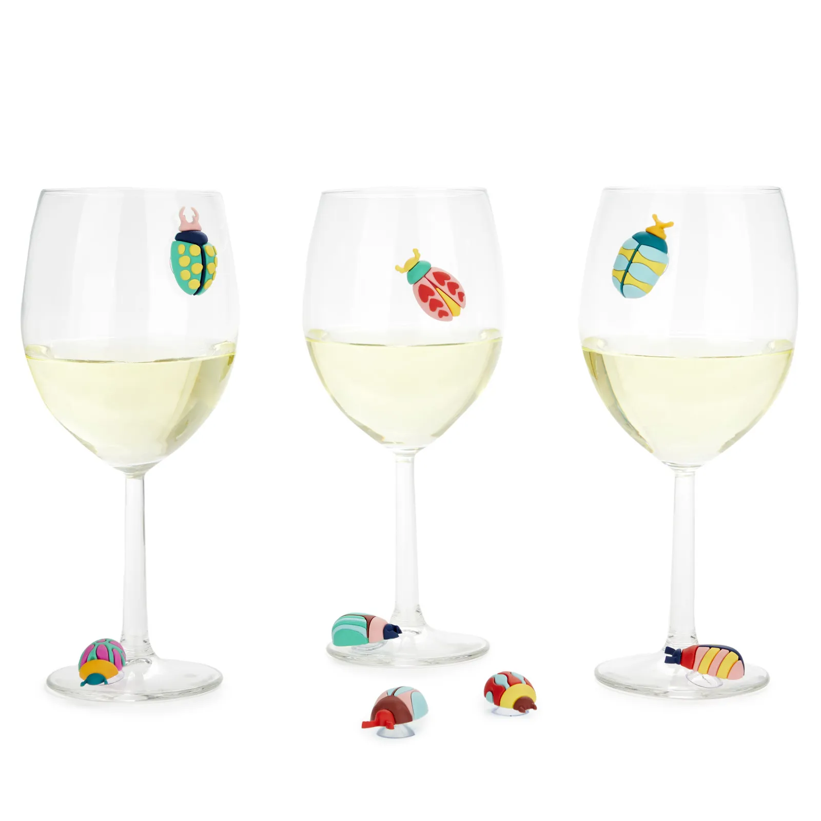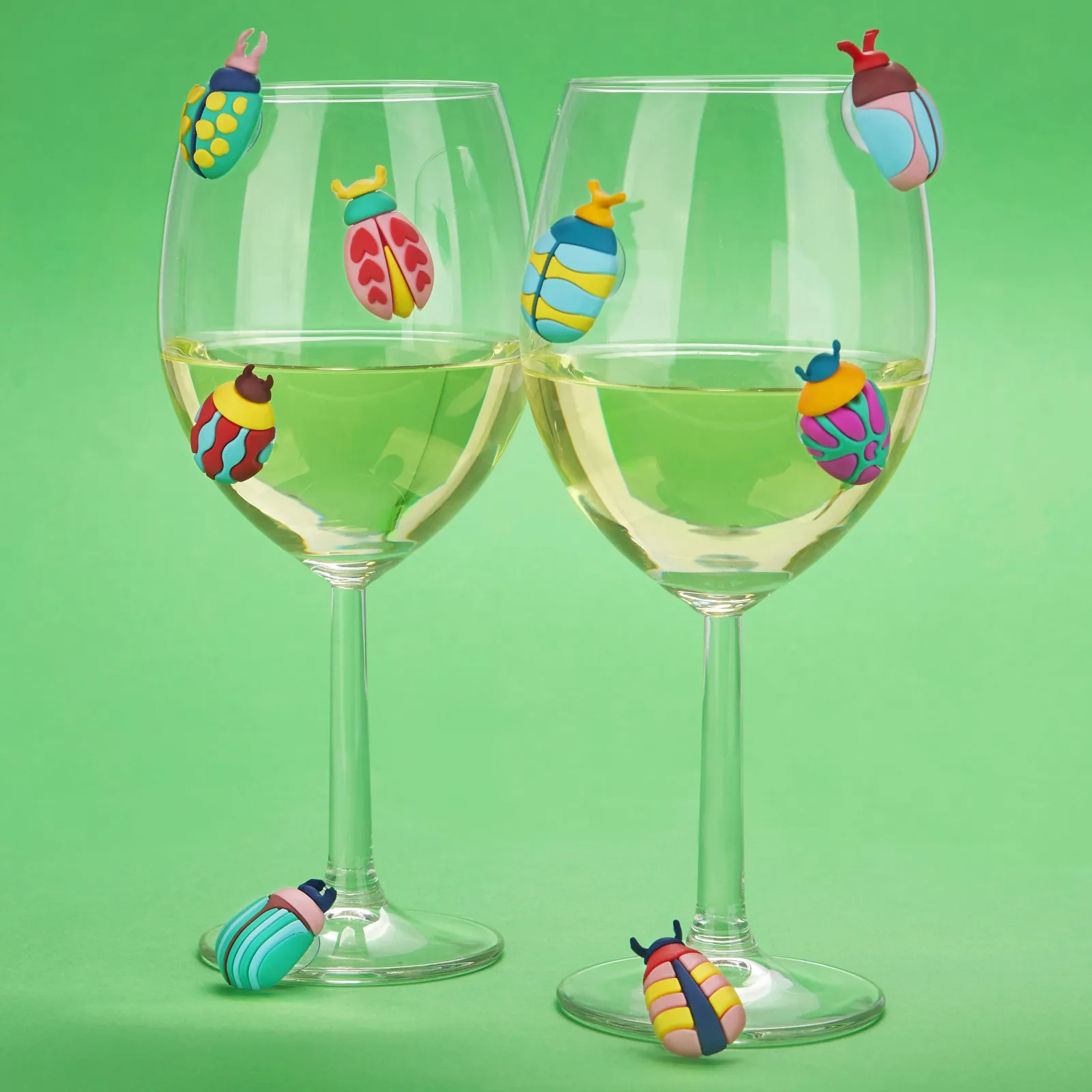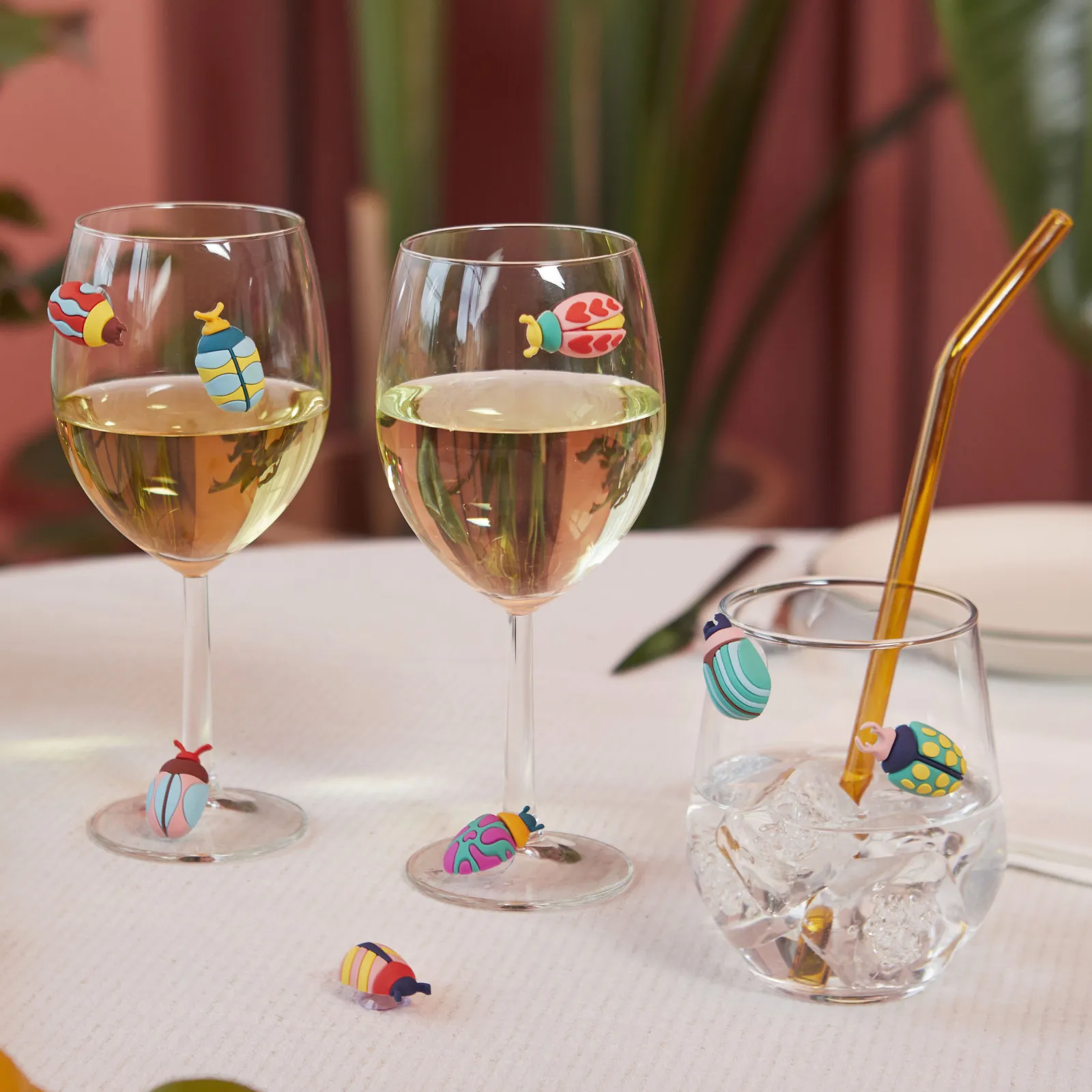 Marcatoarele pentru pahare sunt confecționate din silicon moale, sigur pentru alimente. Sunt flexibile, delicate cu sticla și potrivite pentru orice tip de pahar neted – fie el de vin, suc, apă sau long drink. Alege-ți gândăcelul preferat, prinde-l de pahar și distracția poate începe!