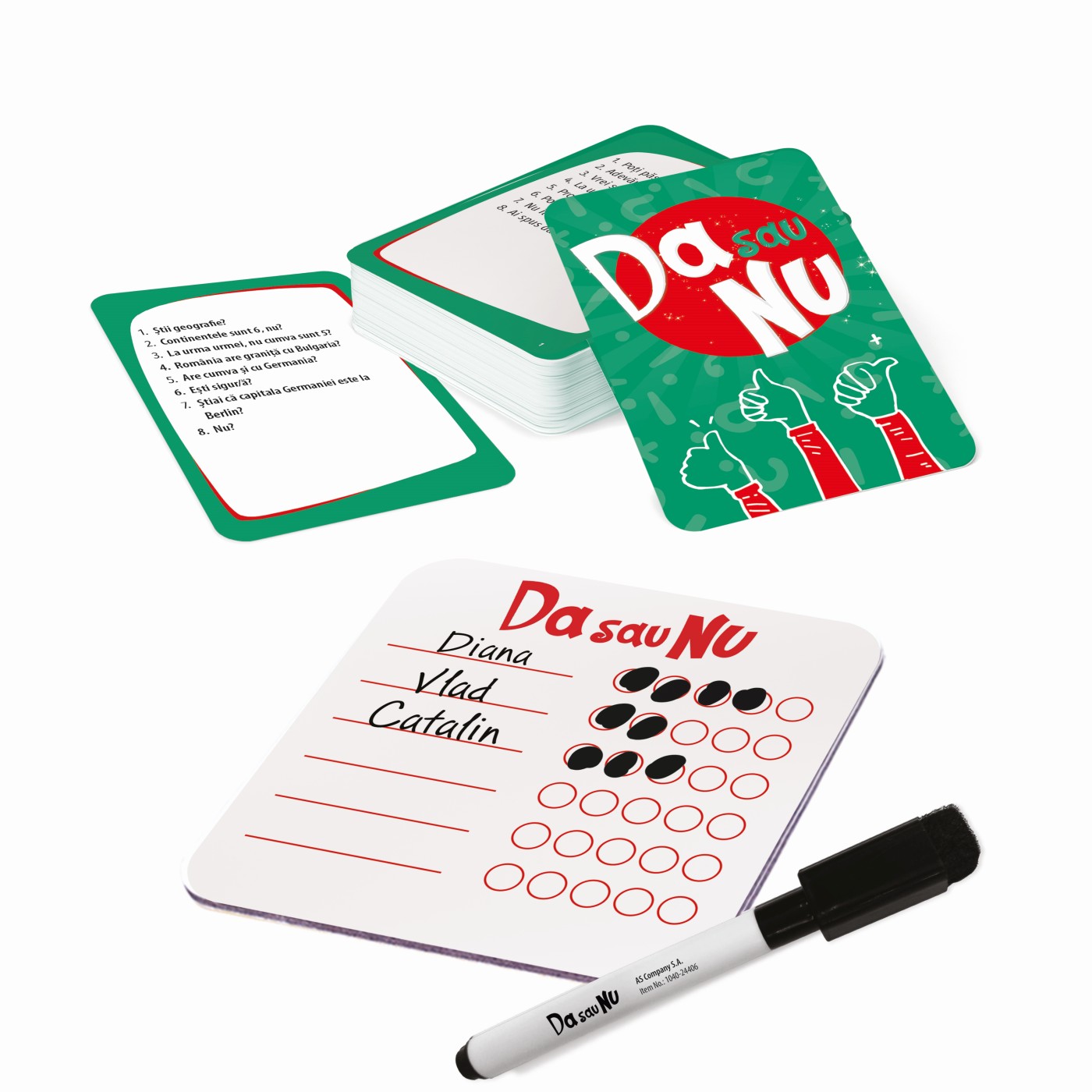Jocul include 60 de carti, 1 carte de scor (reutilizata), 1 marker cu guma de sters.