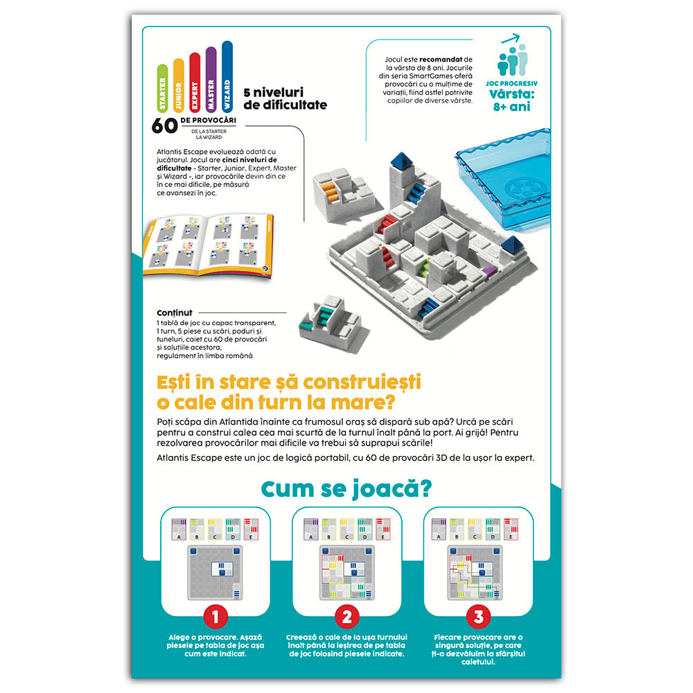 Atlantis Escape este un joc de logica pentru copii din seria Smart Games cu elemente de inalta calitate. Jocul include 60 de provocari logice cu dificultati crescatoare, recomandat pentru varstele 8+, care testeaza si dezvolta abilitatile cognitive ale jucatorilor.