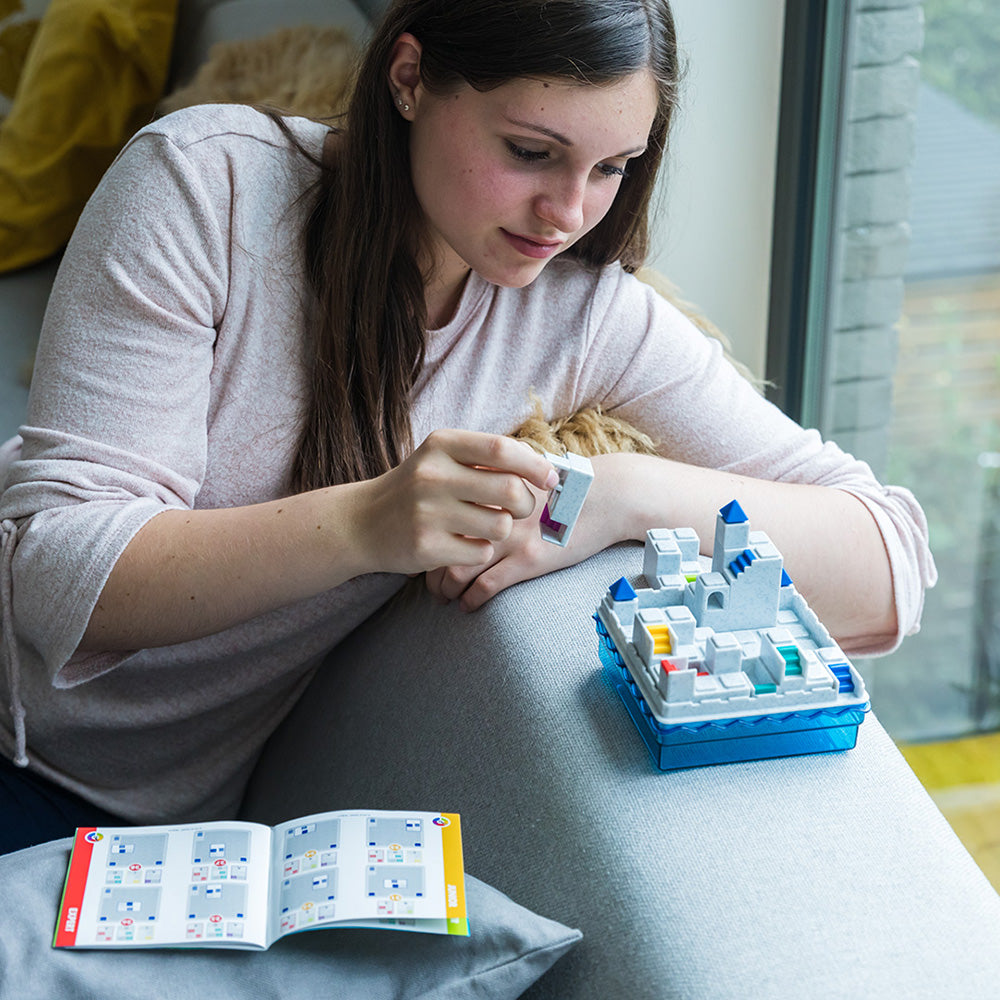 Contine: 1 tabla de joc compacta cu capac transparent albastru, 1 turn inalt, 5 piese de puzzle cu scari, poduri si tuneluri si 1 brosura cu 60 de provocari si solutii.