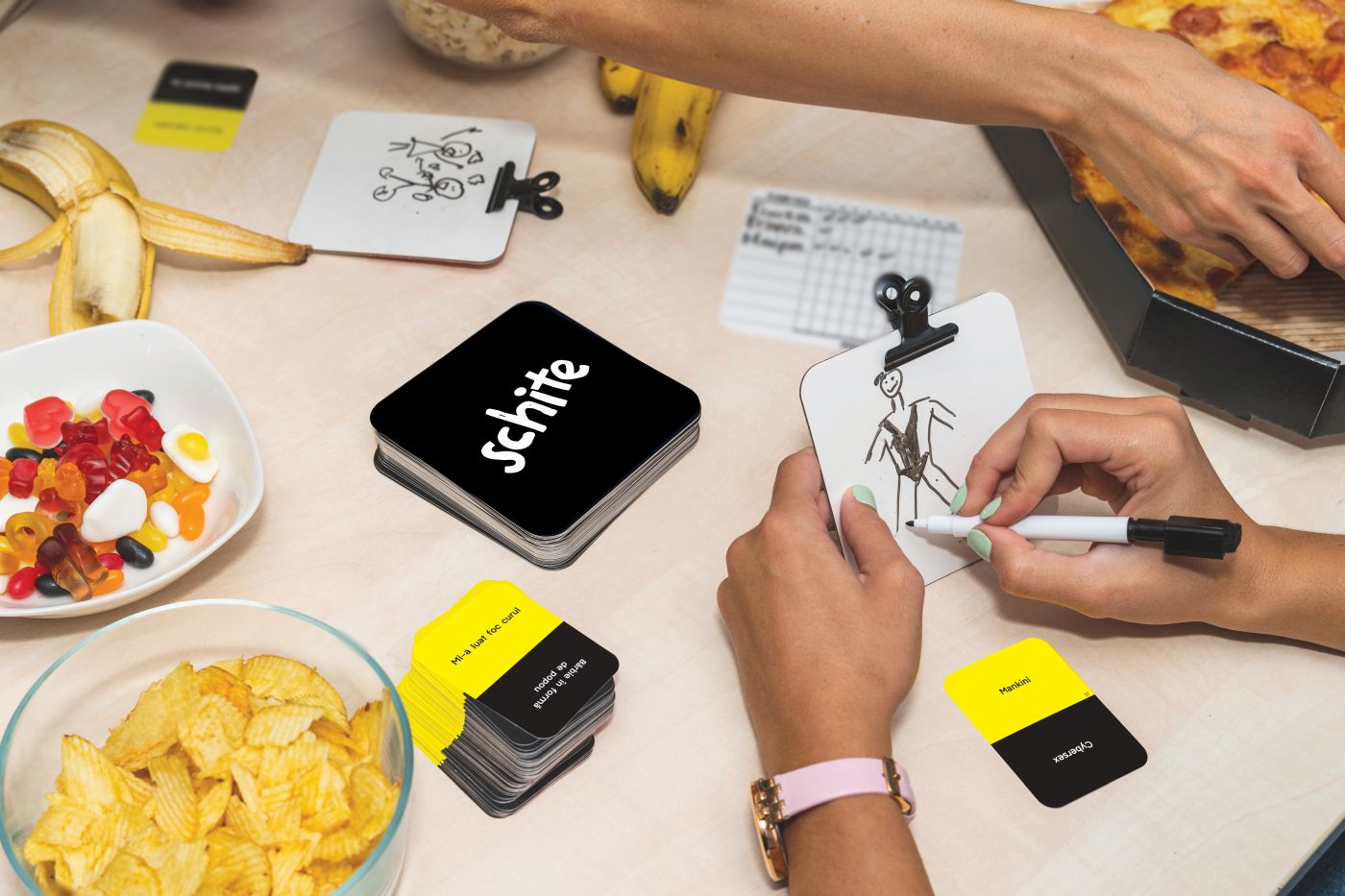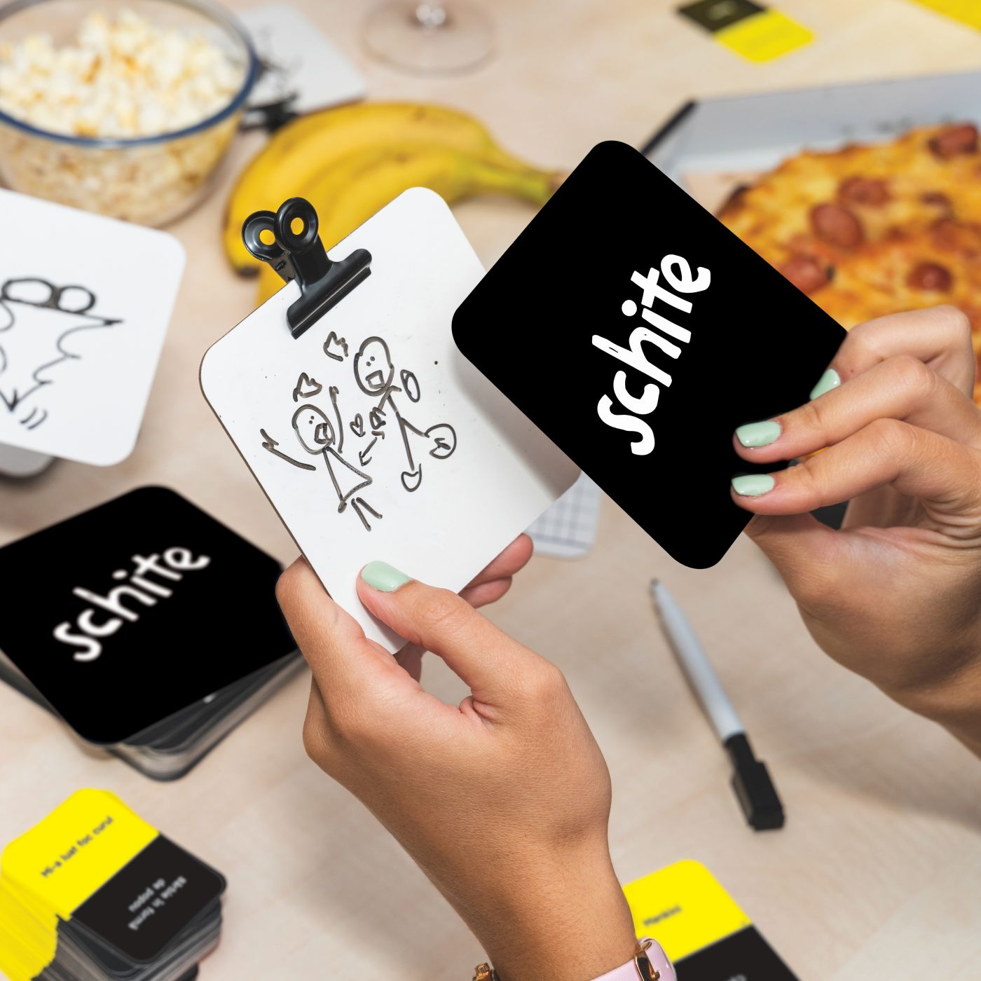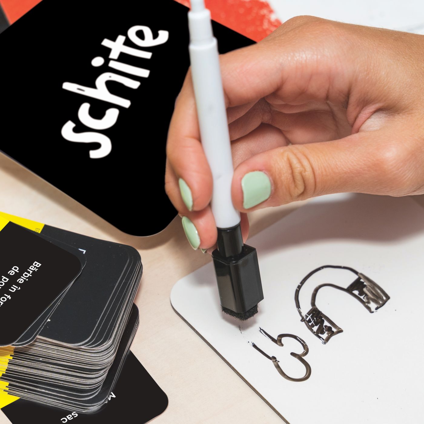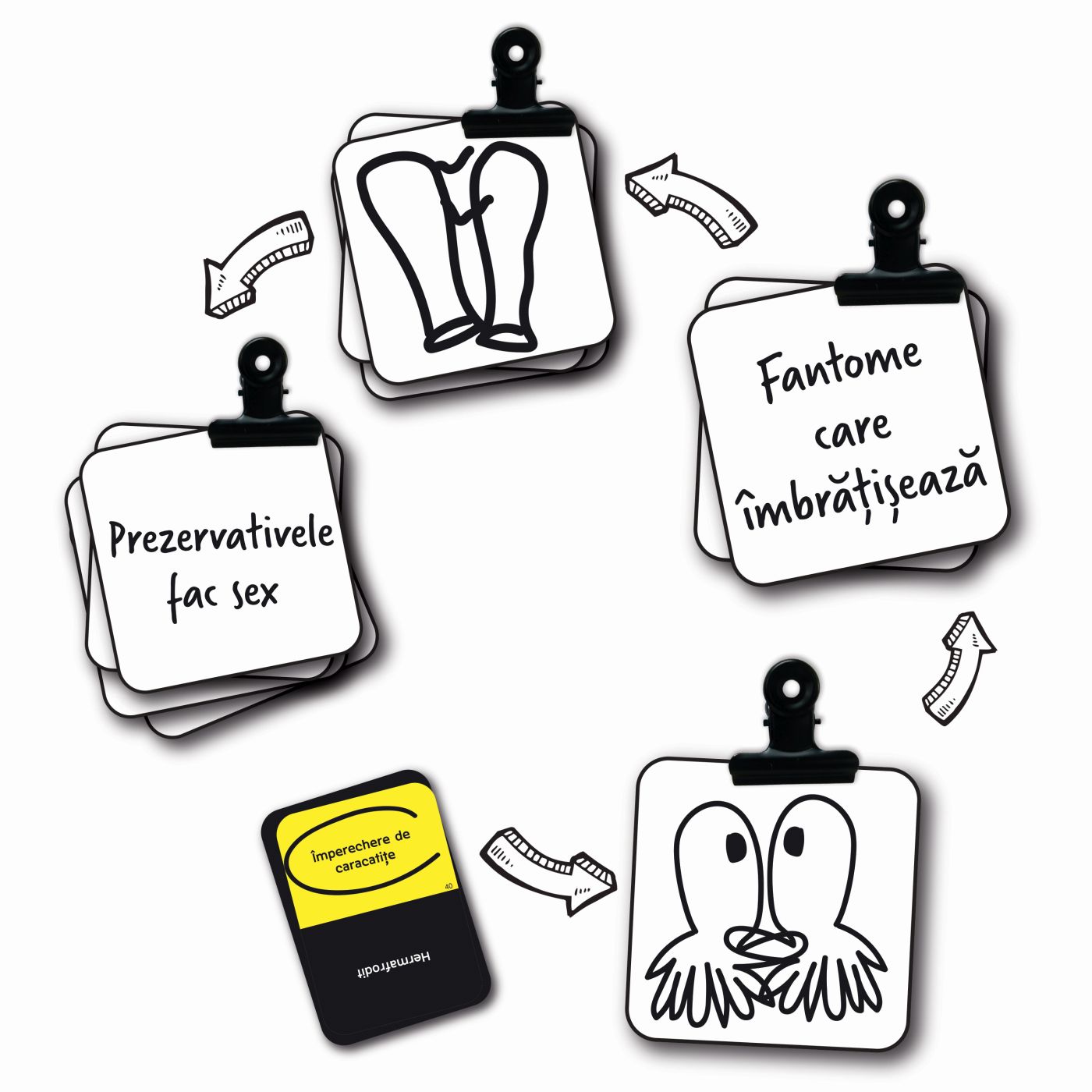 Jocul contine: Cartonase de desen reutilizabile, care se fixeaza una peste alta cu cleme speciale, Markere cu radiera, Carduri cu peste 200 de subiecte uimitoare de desenat, Cartonase pentru numararea punctelor.