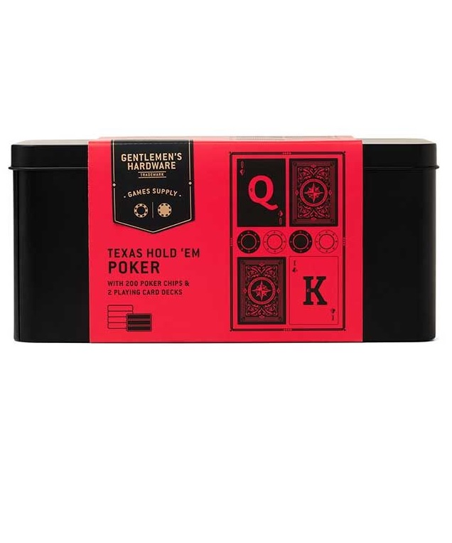 Cutia din metal conține 200 de jetoane pentru poker, 2 pachete de cărți, un buton pentru dealer, un buton ptr small blind și unul pentru big blind.