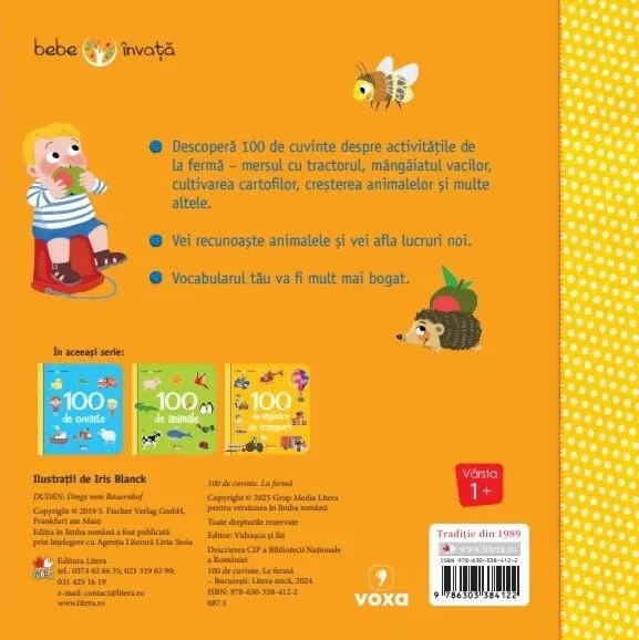 Descoperă 100 de cuvinte despre activitățile de la fermă – mersul cu tractorul, mângâiatul vacilor, cultivarea cartofilor, creșterea animalelor și multe altele. Vei recunoaște animalele și vei afla lucruri noi. Vocabularul tău va fi mult mai bogat.