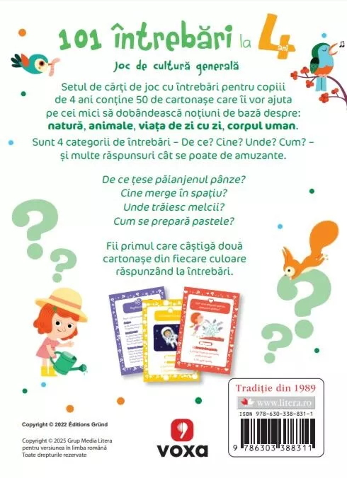 Setul de cărți de joc cu întrebări pentru copiii de 4 ani conține 50 de cartonașe care îi vor ajuta pe cei mici să dobândească noțiuni de bază despre: natură, animale, viața de zi cu zi, corpul uman.