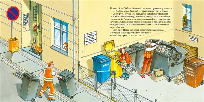 Петер работает водителем мусоровоза. Он встаёт рано утром, чтобы успеть вывезти мусор из жилых кварталов, с центральных площадей и улиц. У Петера есть помощники: поливальные машины, маленькие подметальные машинки, лопаты и мётлы. Ты тоже сможешь помочь Петеру, если научишься сортировать отходы и выбрасывать их в специальные контейнеры.