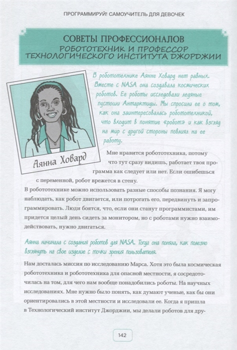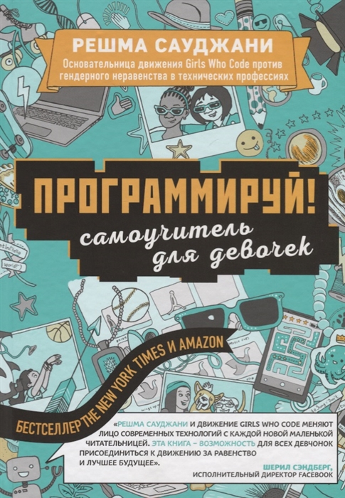 Своей книгой Решма Сауджани, основательница движения «Girls Who Code», которое борется за тендерное равенство в технических профессиях, помогает маленьким читательницам узнать множество интересных и воодушевляющих фактов о программировании. Основы написания кода и работы с компьютером, истории успешных женщин-программистов, краткое введение в языки программирования и возможность создать свою первую программу, а также сотни других полезных вещей, рассказанных понятным языком в дружелюбной манере, — все это вы найдете в книге «Программируй! Самоучитель для девочек».