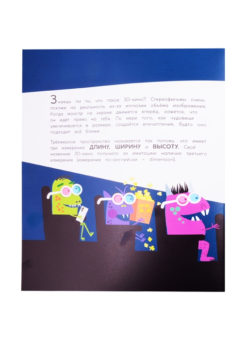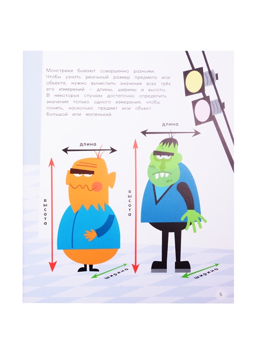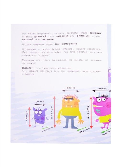 Эта книга о трёхмерном пространстве и объёме, который в нём занимают предметы. Вместе с весёлыми монстриками ваш ребёнок научится находить периметр, площадь и объём предметов, а также узнает, чем отличается двумерное измерение от трёхмерного.
