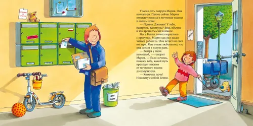 Все книги построены по принципу «один день из жизни...»: герои историй, дети, приходят в гости на работу к своим взрослым знакомым. В этой книге девочка Дженни вместе со своей подругой Марией знакомится с важной профессией почтальона. Вы узнаете, какой путь проходит письмо, прежде чем попадёт к адресату, для чего на конверты клеят марки, как происходит сортировка посылок, в чём их везут из почтового отделения, как почтальон разносит письма и многое другое!