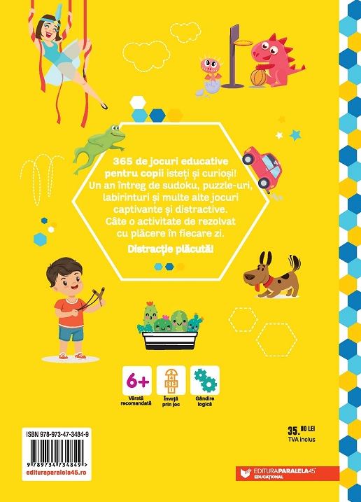 365 de jocuri educative pentru copii isteți și curioși! Un an întreg de sudoku, puzzle-uri, labirinturi și multe alte jocuri captivante și distractive. Câte o activitate de rezolvat cu plăcere în fiecare zi. Distracție plăcută!