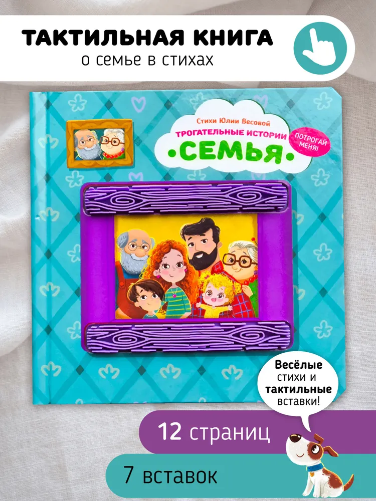 Трогательные истории в забавных стихах болтушках о семье для самых маленьких от Юлии Весовой. Серия инновационных тактильных книг для детей и малышей от 0-1 года, которые не только расскажут об интересных занятиях близких людей, но и позволят прикоснуться к персонажам. Какая борода у папы? Какие волосы у мамы? Какие бусы у бабушки? Какая шляпа у дедушки? Потрогай и узнаешь! Популярная развивающая детская книжка-игрушка для новорожденных с сенсорными вставками из силикона, искусственного меха, мягкой ткани, липучек станет прекрасным оригинальным подарком для дочери и сына на любой праздник: первый День рождения (годик) или Новый год.