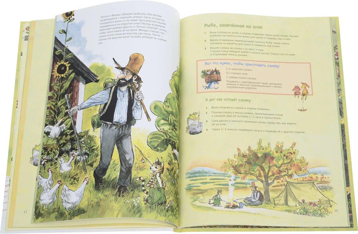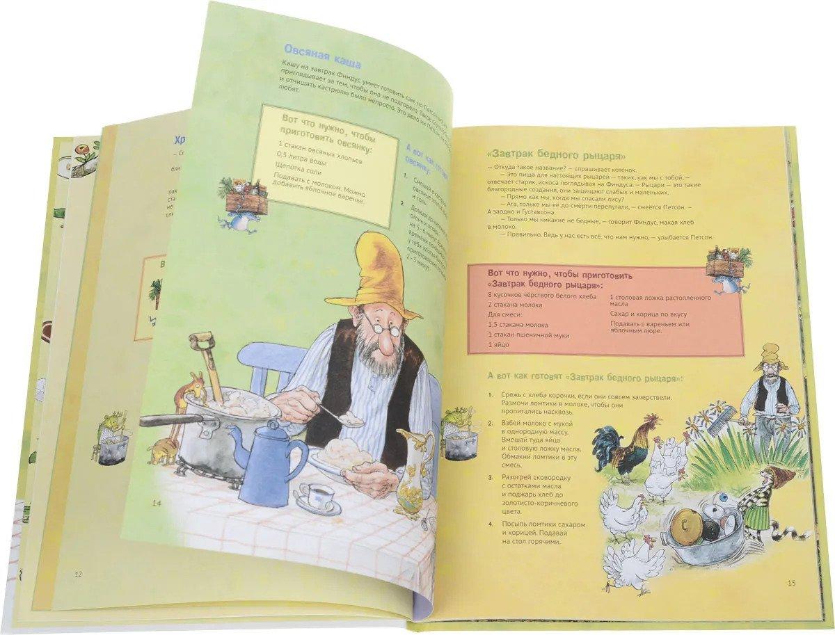 Ни для кого не секрет, что Петсон - старик немного рассеянный. Мука у него может оказаться под диваном, а перец в велосипедной корзине. Его прекрасные рецепты разбросаны по всему дому. Однажды котёнок Финдус решил, что пора собрать их в кулинарную книгу, и вот что из этого получилось! Петсон и Финдус научат вас печь пироги и плюшки, варить супы, кисели, каши и даже готовить морковный мармелад. Рецепты у Петсона очень простые и вкусные, к тому же каждому из них предшествует небольшая история из жизни старика и котёнка. Большинство блюд дети постарше могут приготовить сами, а для самых маленьких предусмотрены задания попроще, которые обычно выполняет Финдус: скатать из фарша тефтельки, смешать соус, отмерить молоко и муку или натолочь сухари.
