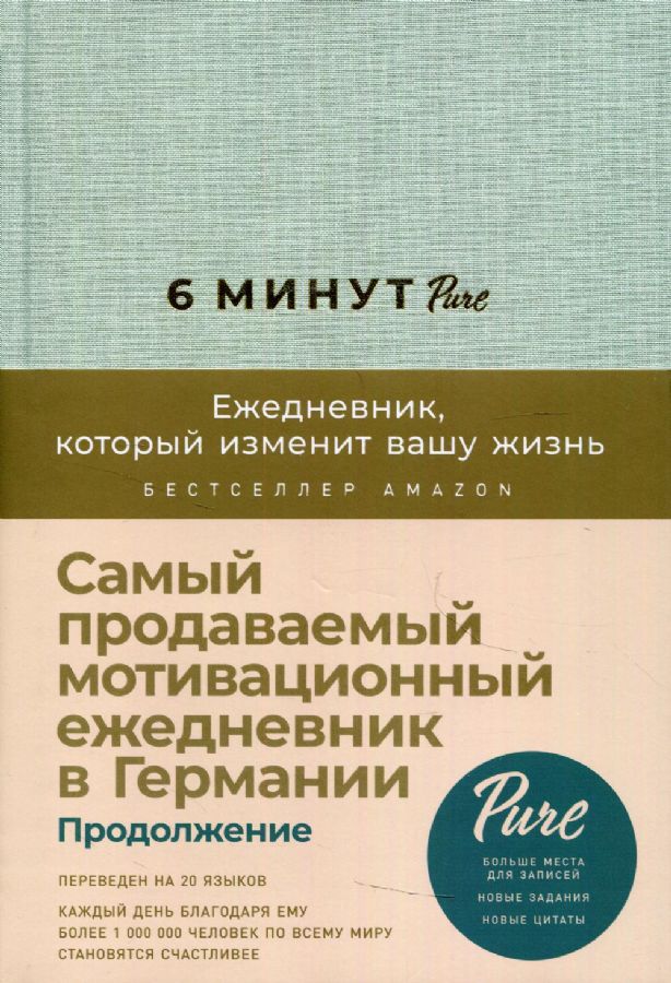 "6 минут PURE" - это продолжение бестселлера Amazon, самого продаваемого в Германии мотивационного ежедневника "6 минут. Ежедневник, который изменит вашу жизнь". Доминик Спенст создал новое издание по многочисленным просьбам и пожеланиям читателей. В ежедневнике теперь меньше теории и больше страниц для самостоятельного заполнения, а еще - новые еженедельные ритуалы, цитаты, задания и вопросы.Подойдет тем, кто уже знаком с первым изданием и хочет продолжить заполнять ежедневник в новом формате, а также тем, кто только начинает знакомиться с Принципом 6 минут®.